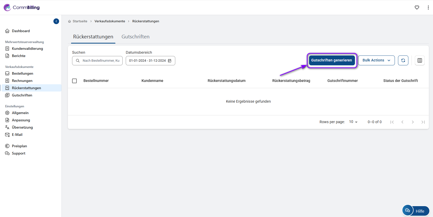 Um eine neue Rückerstattung zu bearbeiten, klicken Sie auf die Schaltfläche Gutschrift generieren. Durch diese Aktion wird eine Gutschrift erstellt, die mit der ursprünglichen Rechnung verknüpft ist und dem Kunden als Nachweis für die Rückerstattung zugesandt werden kann. Die Nummer der Gutschrift wird nach der Erstellung in der Spalte Gutschriftsnummer angezeigt.