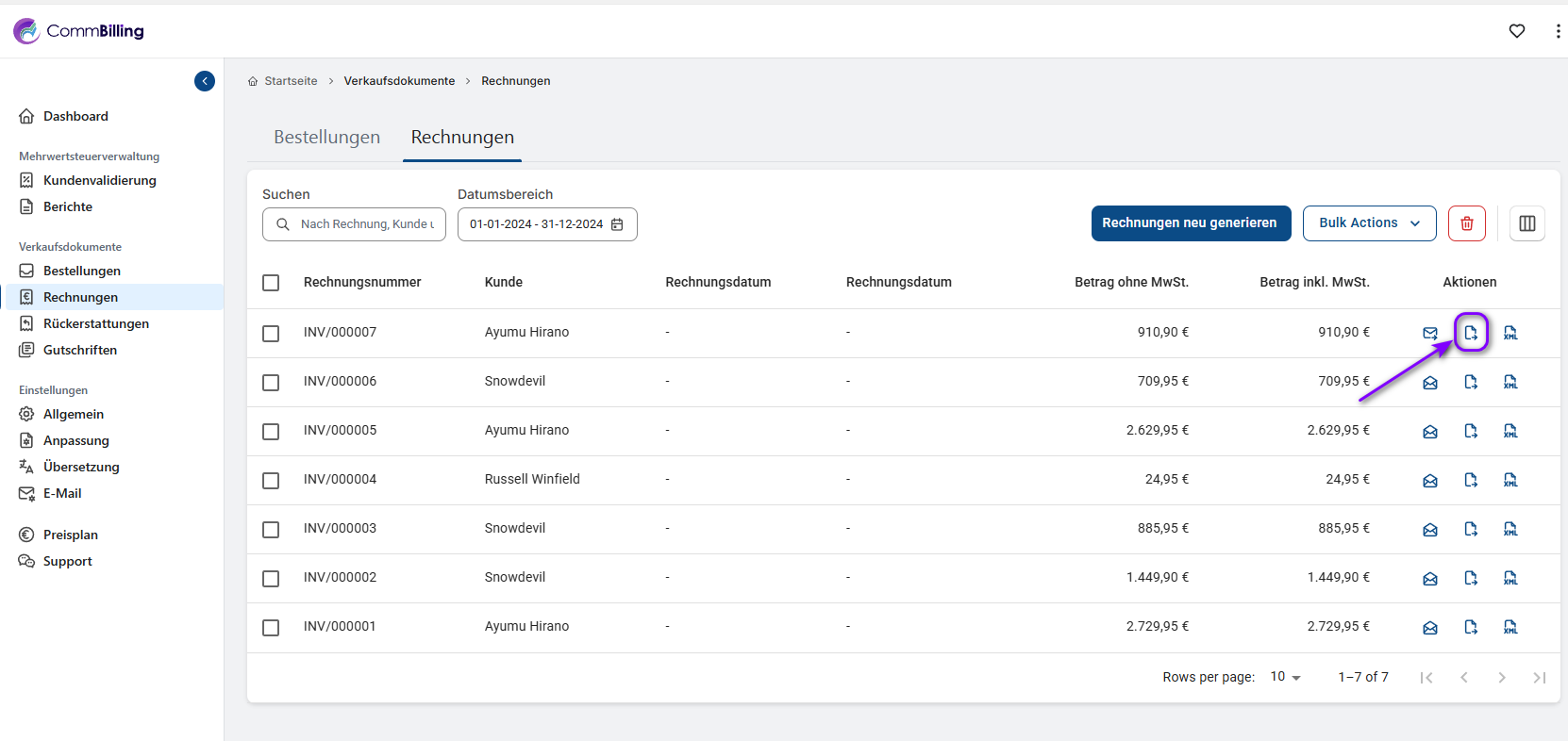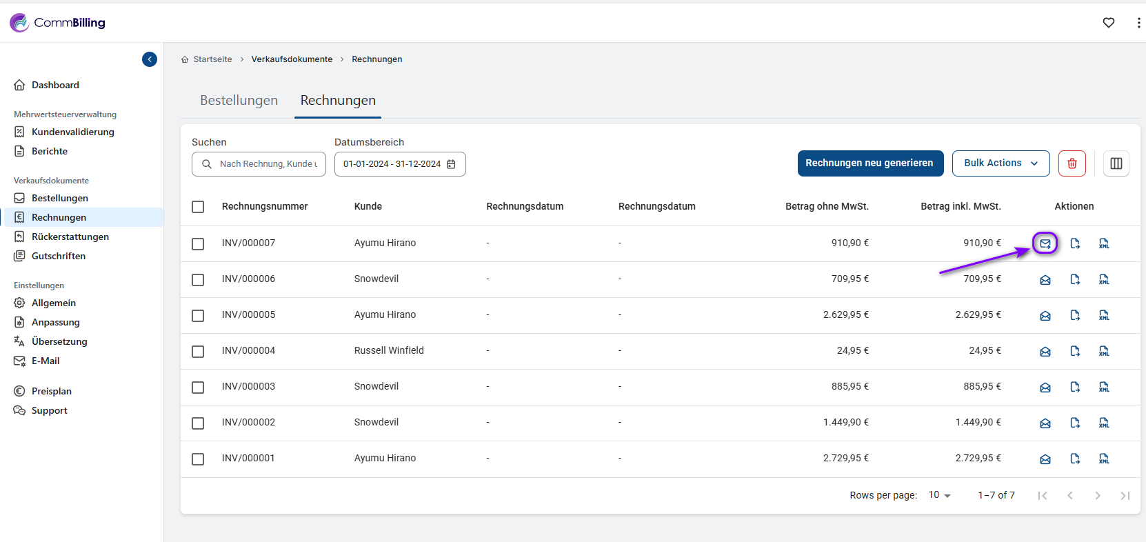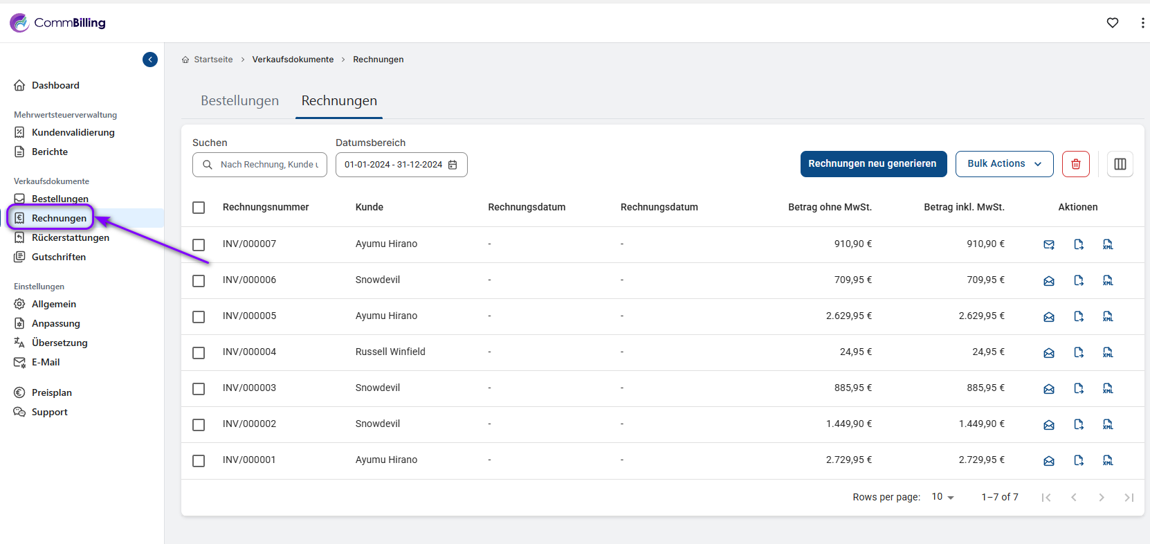 - Klicken Sie im Hauptmenü auf "Rechnungen", um eine Liste aller erstellten Rechnungen anzuzeigen.