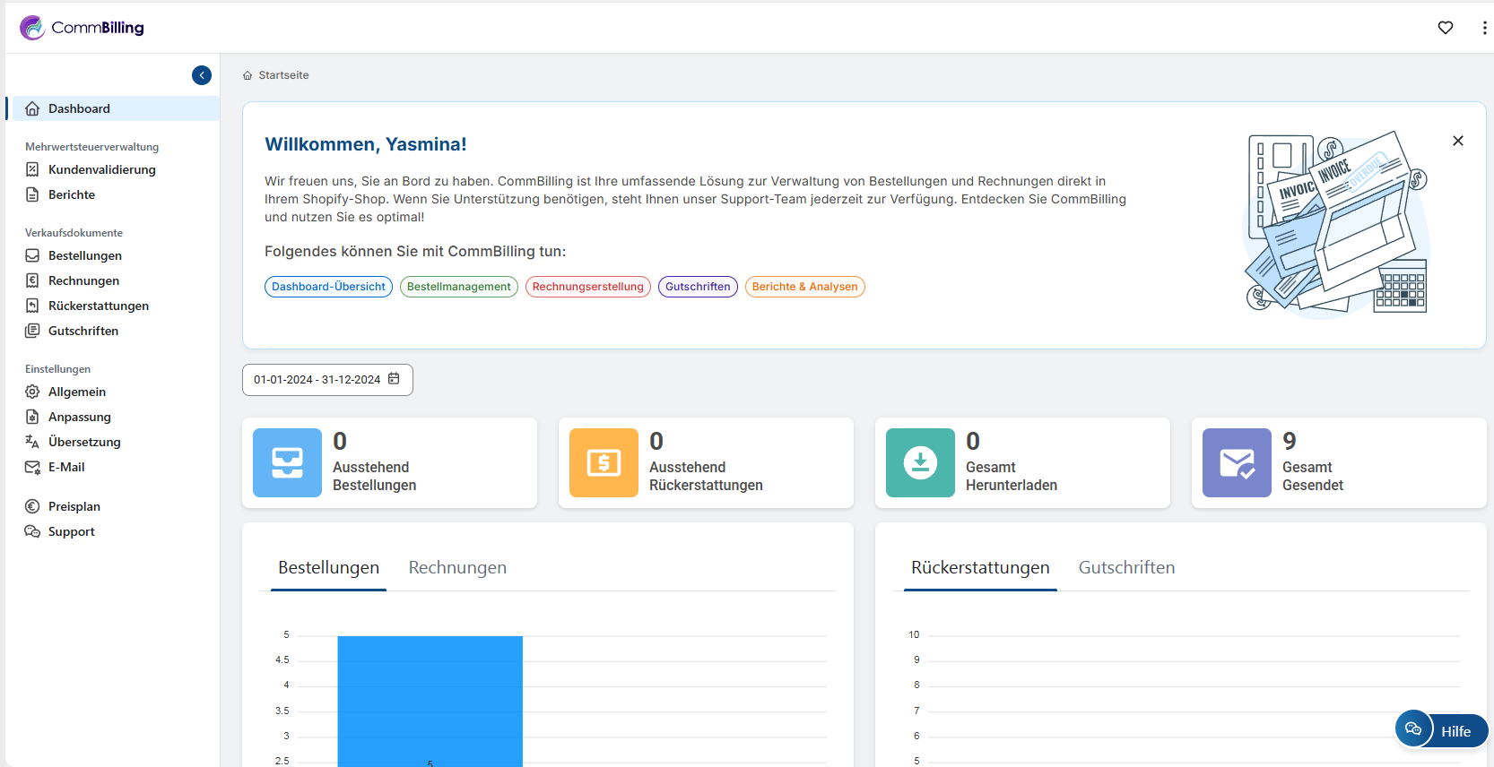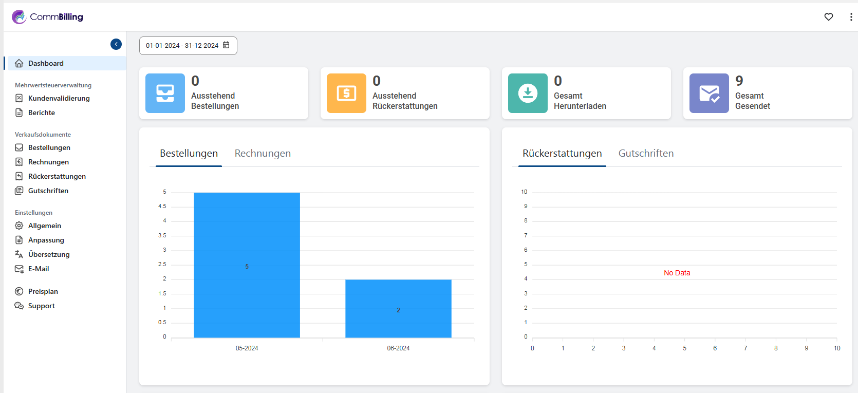 CommBilling bietet ein Dashboard mit wichtigen Kennzahlen und grafischen Darstellungen Ihrer Geschäftstätigkeit, die Ihnen schnelle Einblicke in Bestellungen, Rechnungen, Rückerstattungen und Gutschriften ermöglichen. Nutzen Sie diese Tools, um die Leistung zu überwachen und datengestützte Entscheidungen zu treffen.