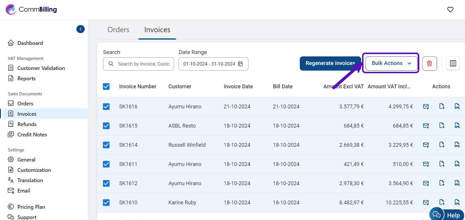 - Use the checkboxes next to each invoice to select the invoices you want to process in bulk. You can also use filters (like date range or status) to narrow down your selection for easier management.