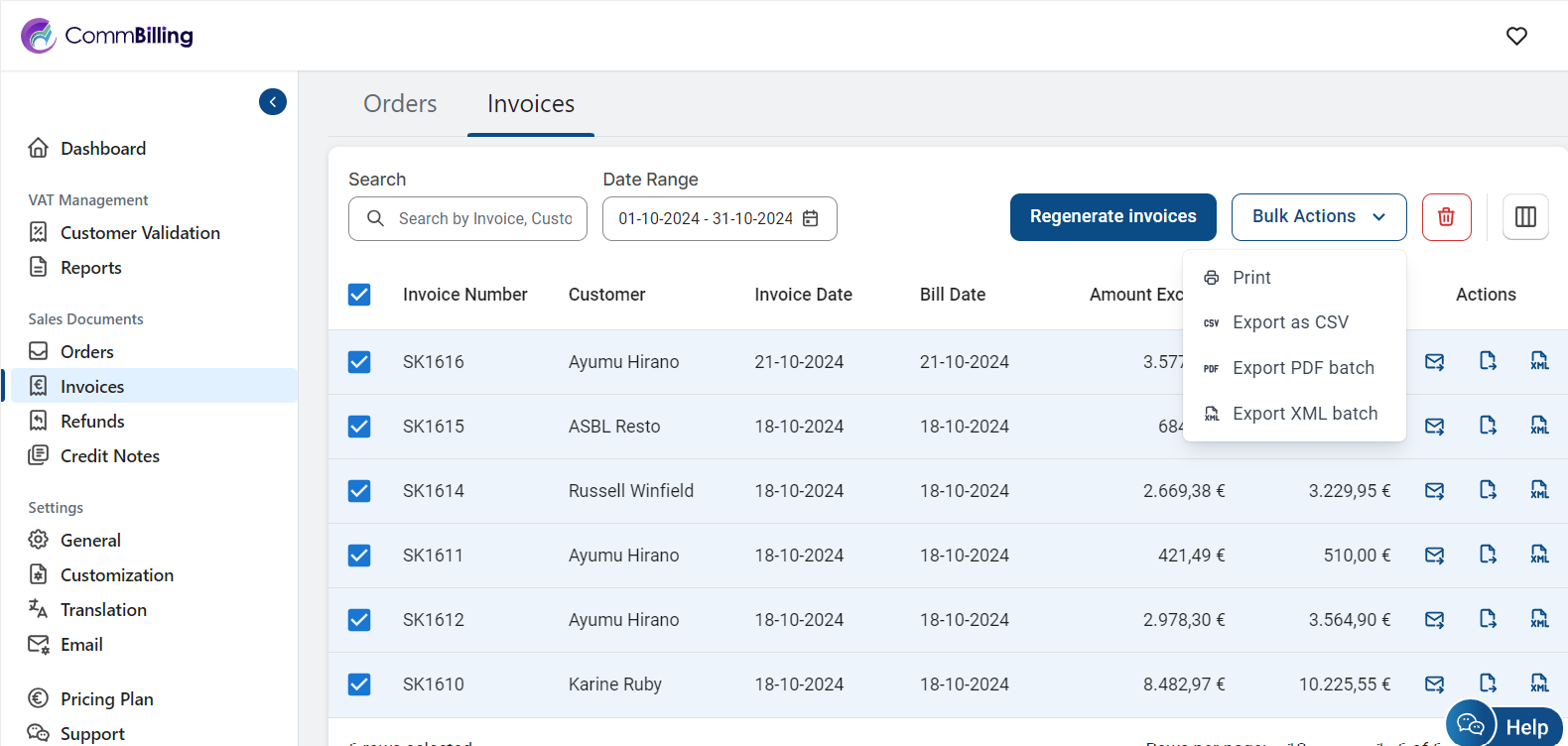 - Export as CSV : Select this option if you want to download the selected invoices as a CSV Batch.