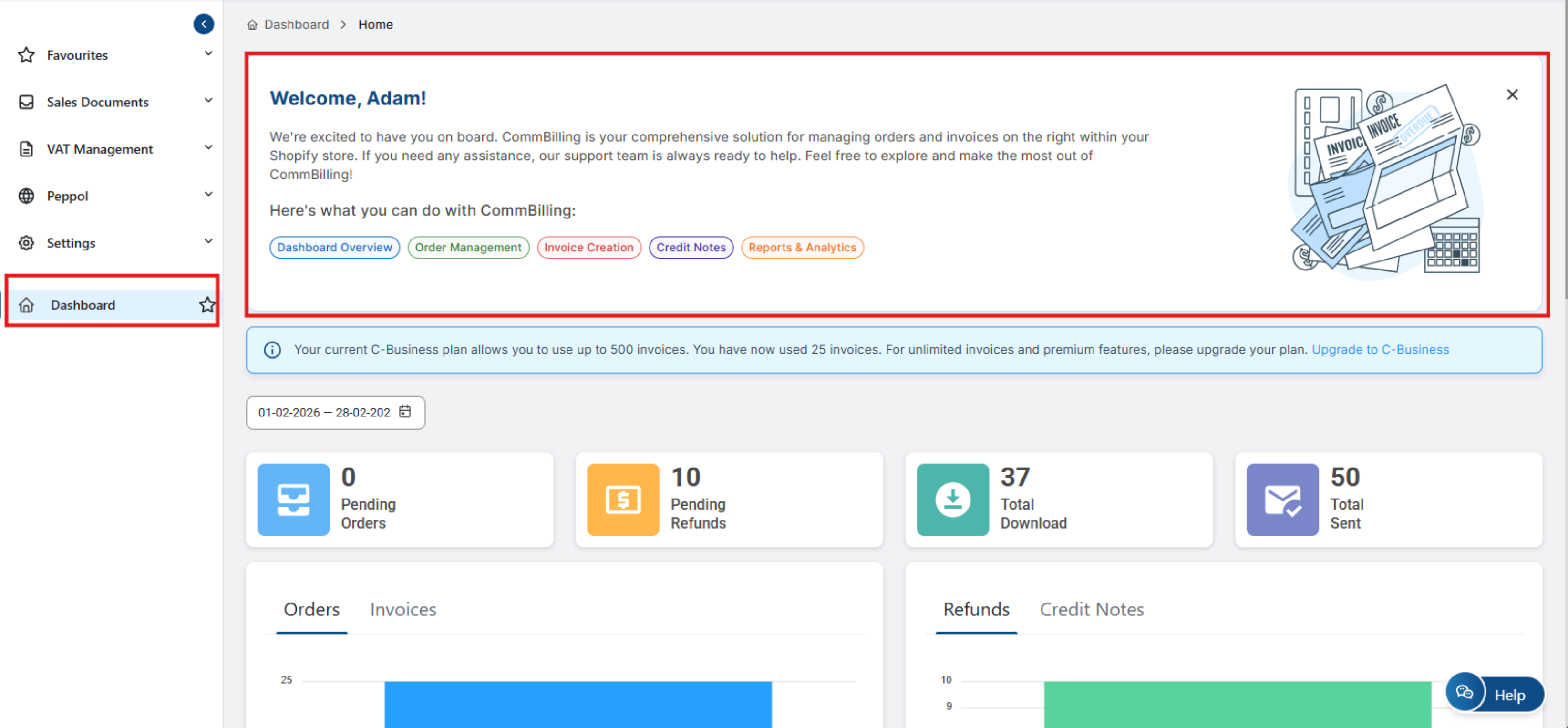 The Dashboard Tab in Billova is your primary control center for managing billing, invoices, and orders within your Shopify store. Here's a detailed look at each section within the tab: