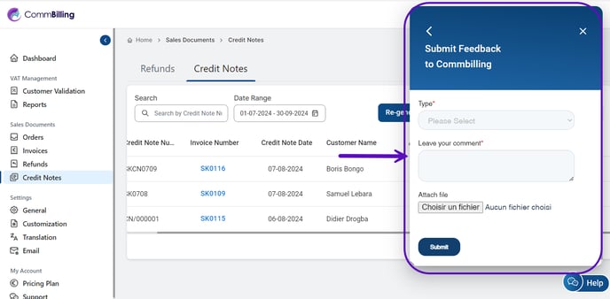 Submit Feedback: This option provides a form where you can share your thoughts, suggestions, or report any issues you encounter with CommBilling. It’s a direct way to communicate with the CommBilling team and help improve the app.