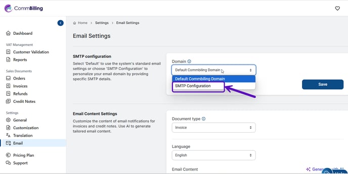 5. Click Save to apply your custom email domain settings.