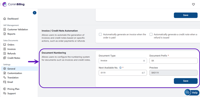 - Log in to your Shopify account and go to the "General" tab in CommBilling settings, section Document numbering