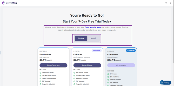 - After the onboarding is complete, you will be redirected to the pricing plan page. Selecting a plan is required before you can start using CommBilling, and the seven day trial is available for plans C-Starter and C-Business.