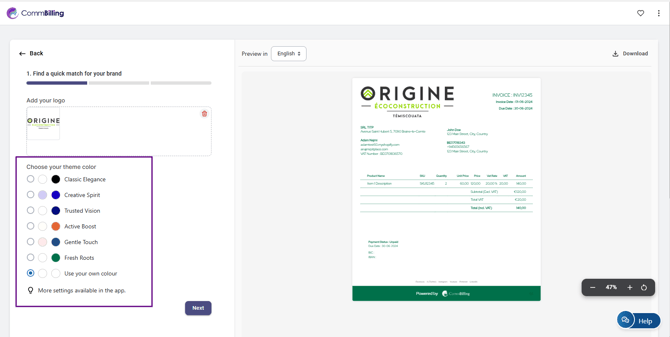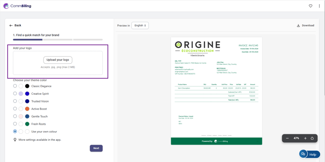 - Step 1: Upload your company logo, choose your theme color, and click on the button "Next".