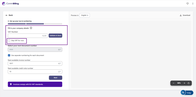 - Step 2: Enter your VAT number and click on the button "Validate and Save" or select the option "Skip VAT for now" if you do not have one.