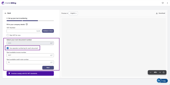 Choose whether you want the same numbering for all documents or separate numbering for invoices and credit notes, then click on the button "Next".
