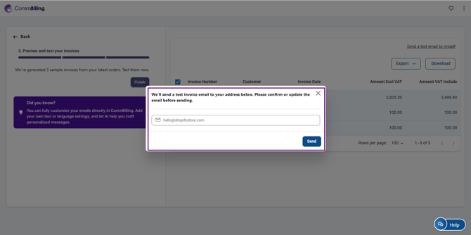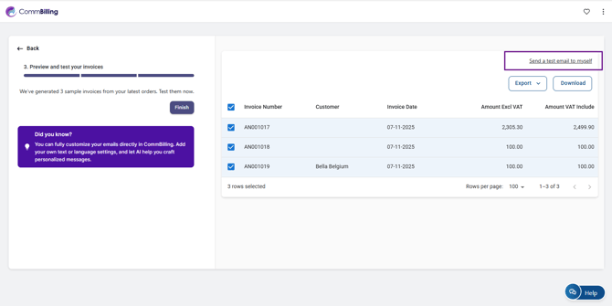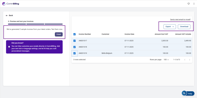 Your quick setup is now complete, and your billing app is ready for use. You can now start generating invoices, with the added benefit that CommBilling automatically generates three invoices for free as part of your onboarding experience. Further customization can be completed anytime in the Settings tab.