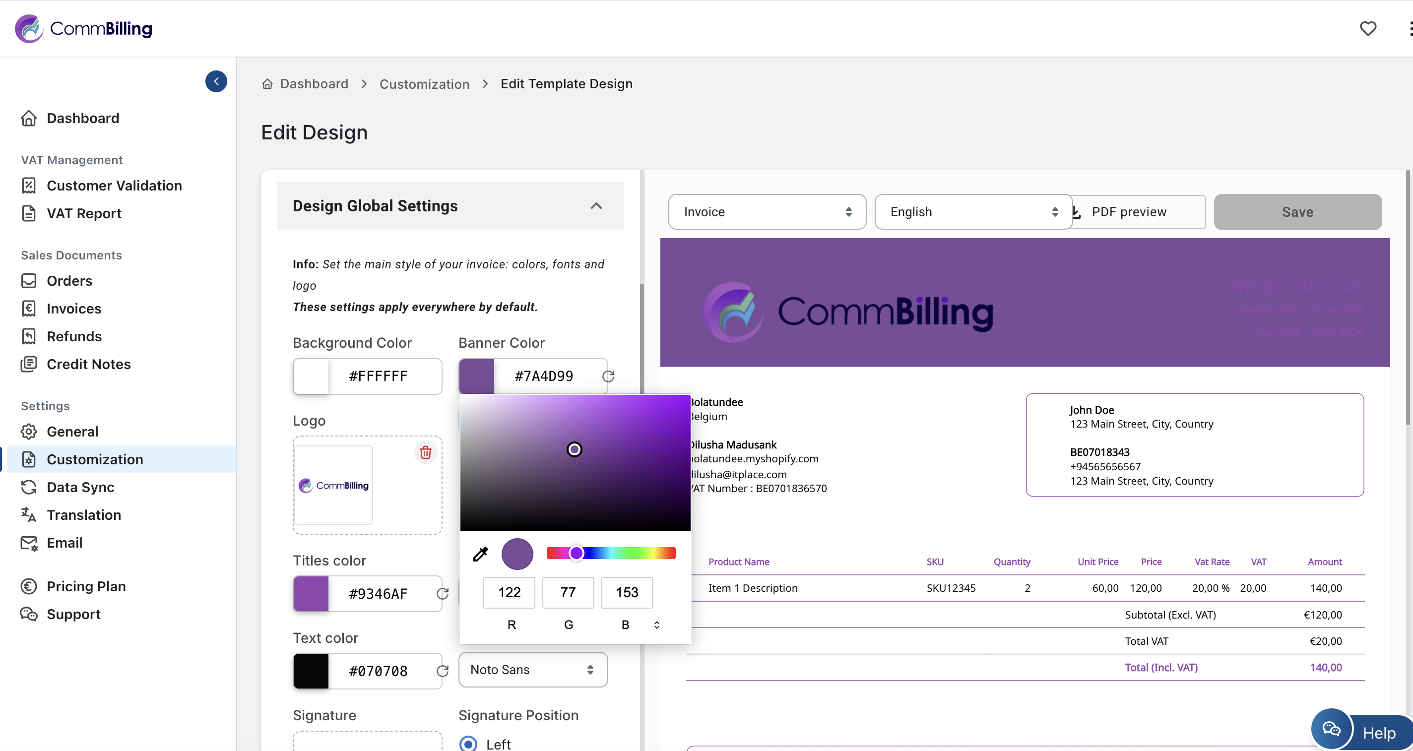 With CommBilling’s predefined professional templates, you already start from a business-ready design. The added flexibility to personalize background, banner, and title colors allows your invoices to fully reflect your brand’s visual identity while maintaining clarity and elegance.