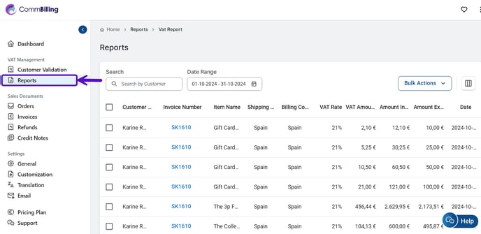 - Step 2: Click on the Report tab to access a comprehensive list of all orders and invoices, displaying the VAT applied for each country.