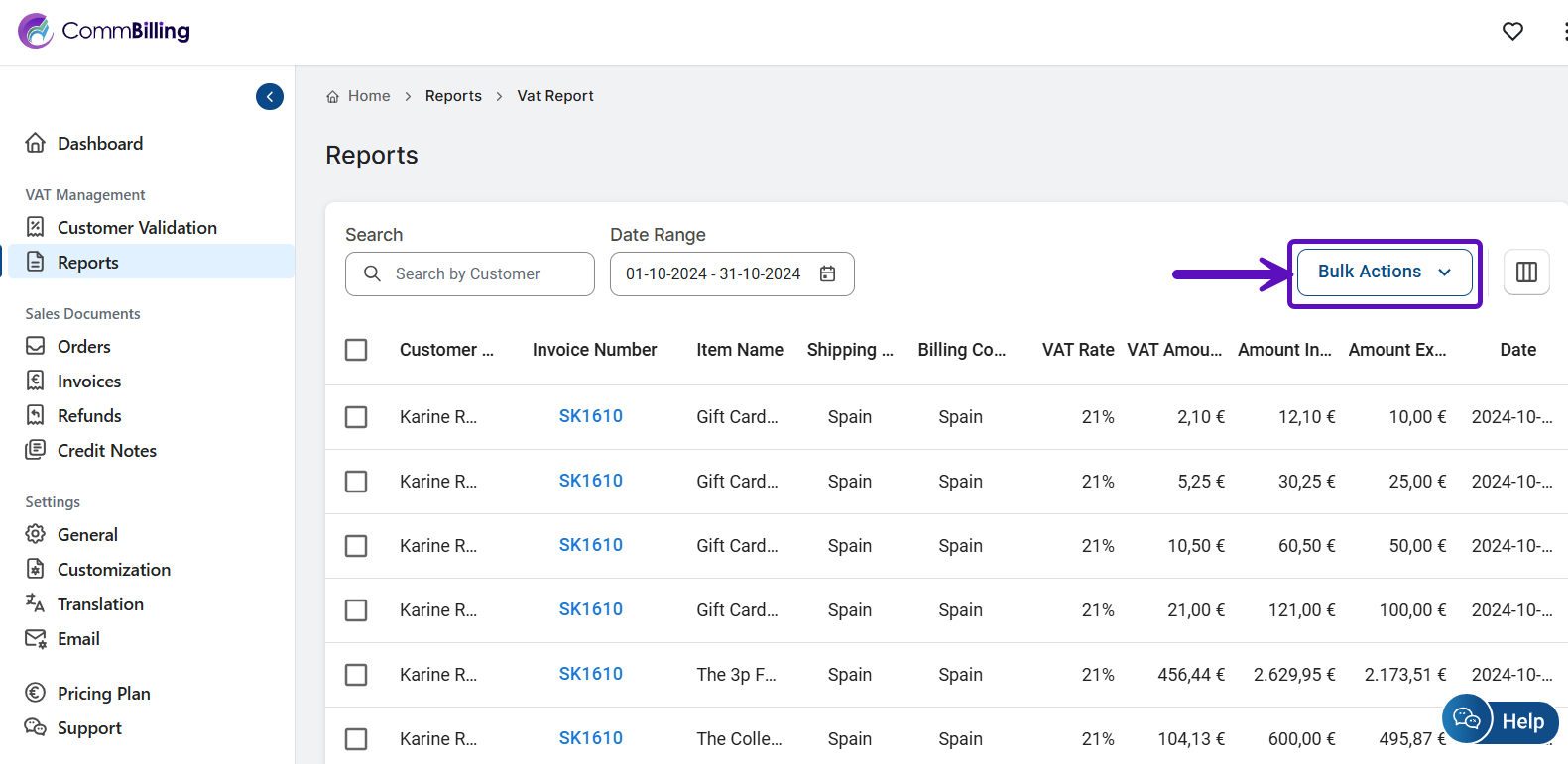 In CommBilling, tax reports provide an organized view of all orders and invoices, along with the VAT applied by country. With filtering options and bulk actions, you can easily customize and export reports, making it simpler to manage financial reporting and stay aligned with tax obligations.