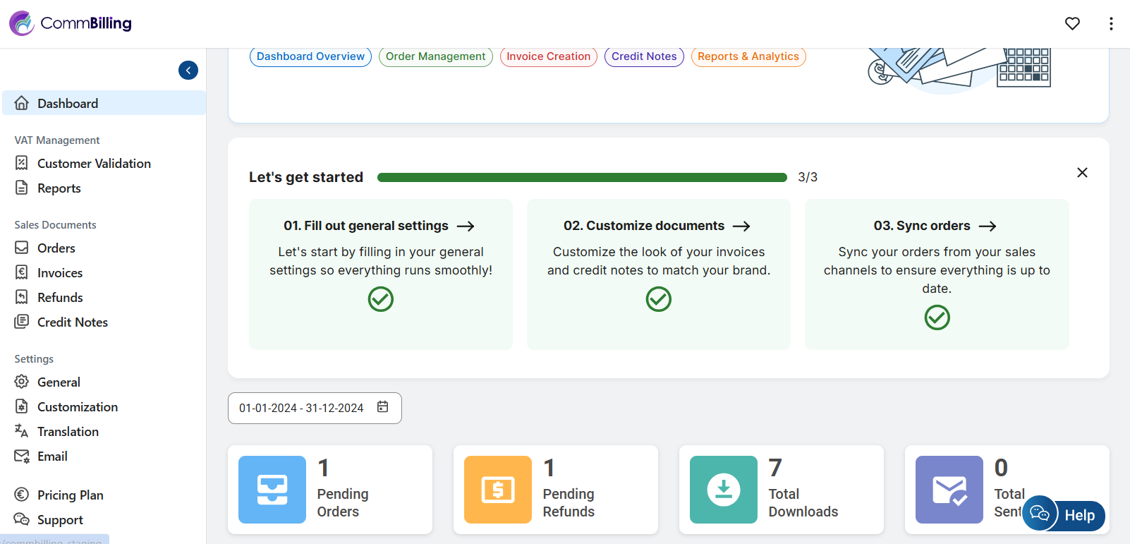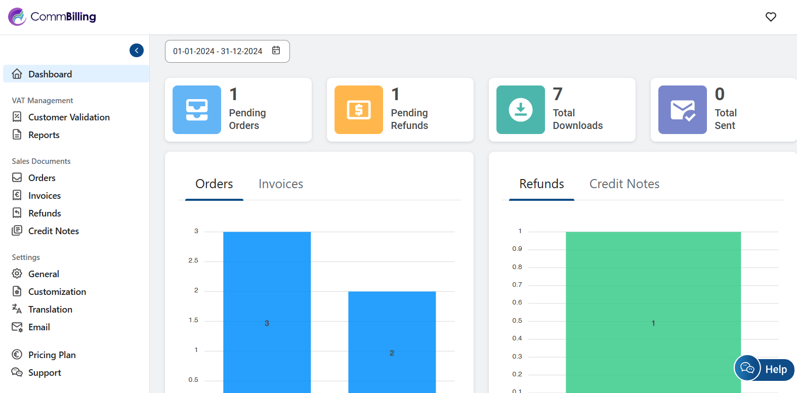 CommBilling provides a dashboard with key metrics and graphical representations of your business activity, giving you quick insights into orders, invoices, refunds, and credit notes.