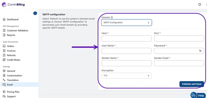 To ensure that your emails are sent from our server, click on "Default Commbilling Domain then press 'Validate".