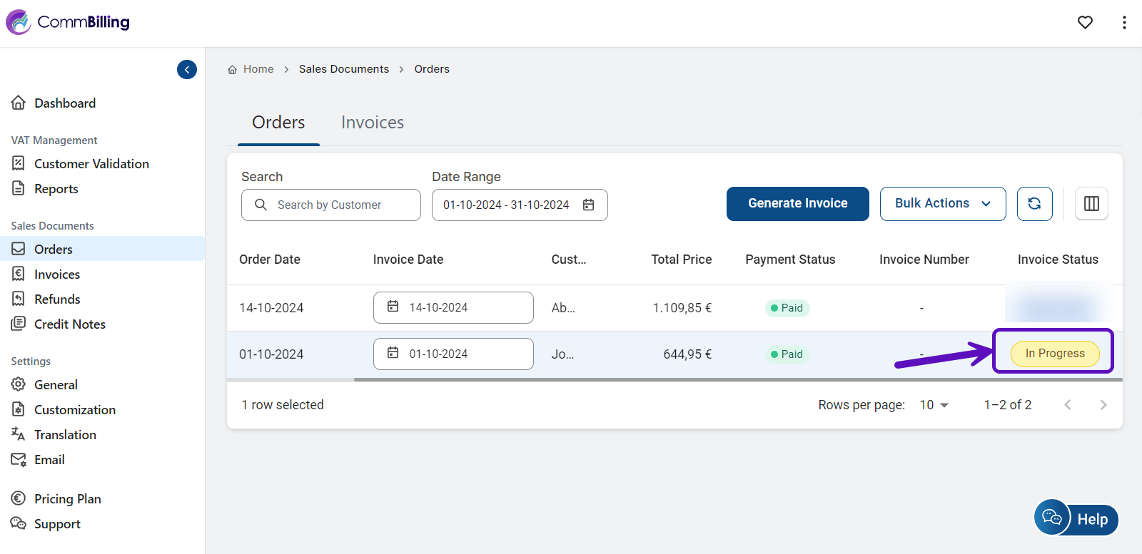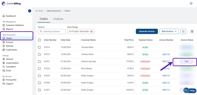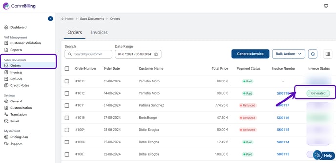 - Orange - Failed: The invoice generation failed due to an error. You may need to review the information and try again or contact the support.