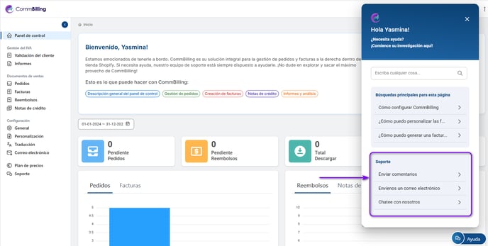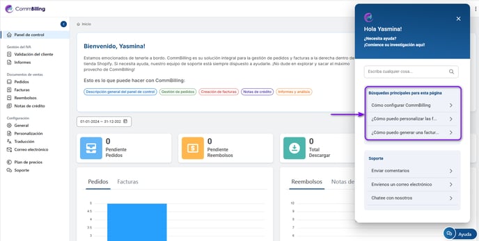 El botón Ayuda de CommBilling proporciona todos los recursos que necesita para utilizar correctamente la aplicación, ofreciendo un acceso rápido a asistencia y artículos útiles. Esta sección está diseñada para garantizar que cualquier problema o pregunta que pueda tener pueda resolverse de manera eficiente, para que pueda centrarse en el funcionamiento de su negocio.