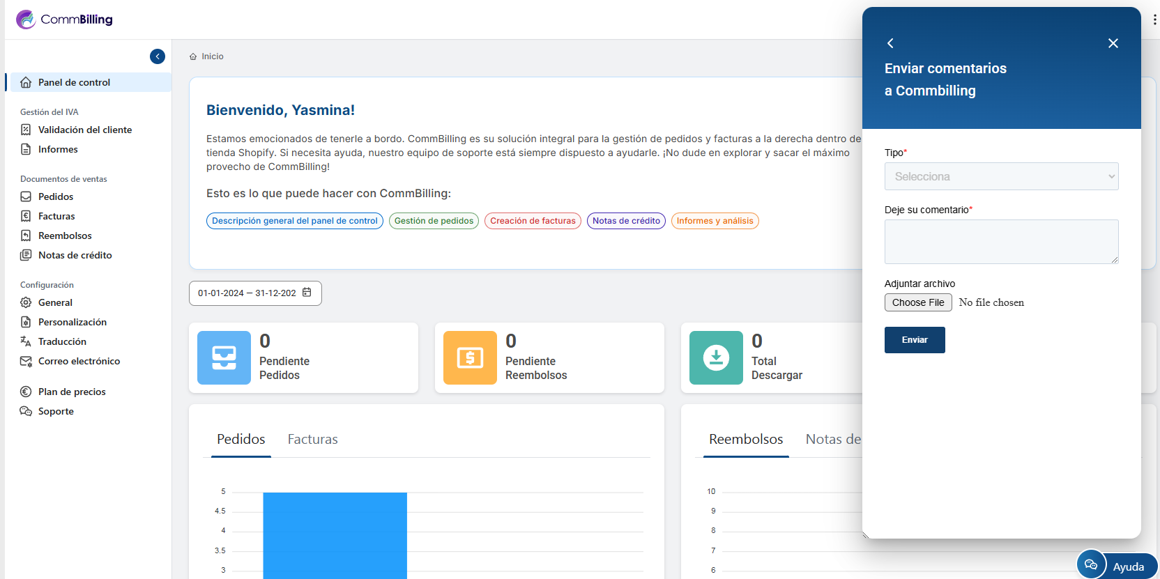 • Enviar comentarios: Esta opción proporciona un formulario donde puedes compartir tus opiniones, sugerencias o informar de cualquier problema que encuentres con CommBilling. Es una forma directa de comunicarse con el equipo de CommBilling y ayudar a mejorar la aplicación.