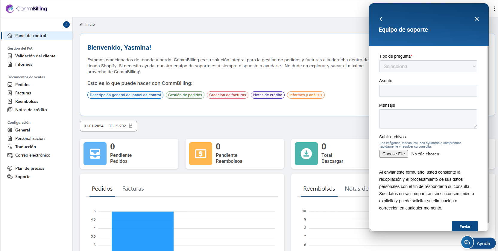 Con el Botón de Ayuda, tendrá fácil acceso a toda la orientación y asistencia necesarias para sacar el máximo partido de CommBilling. Tanto si prefiere encontrar las respuestas usted mismo como si prefiere ponerse en contacto con el equipo de asistencia, estos recursos le garantizan que podrá resolver cualquier problema de forma rápida y eficaz.