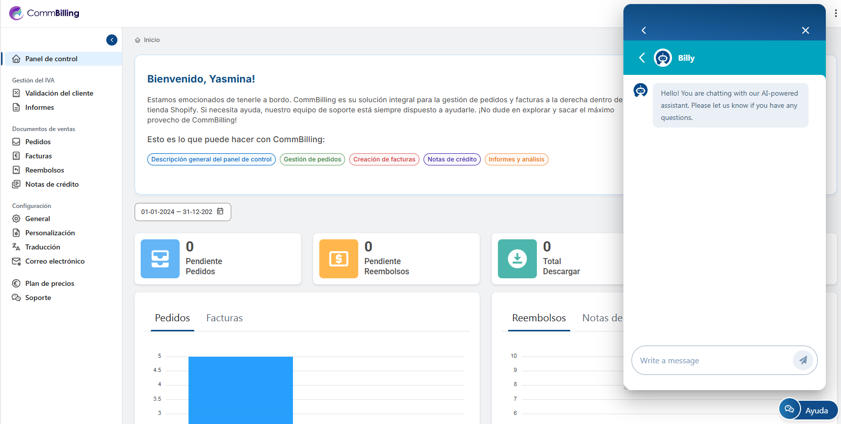 • Chatee con nosotros: CommBilling ofrece una opción de chat con IA para ayudarle a responder a sus preguntas en tiempo real. La IA está diseñada para gestionar la mayoría de las consultas, pero si necesita ayuda adicional, también existe la posibilidad de hablar con un humano. Sin embargo, esta función sólo es accesible para los usuarios del Plan C-Business, dándoles acceso prioritario a la asistencia humana cuando sea necesario.