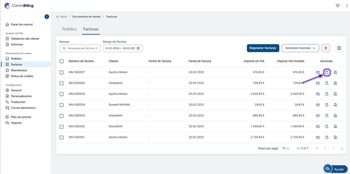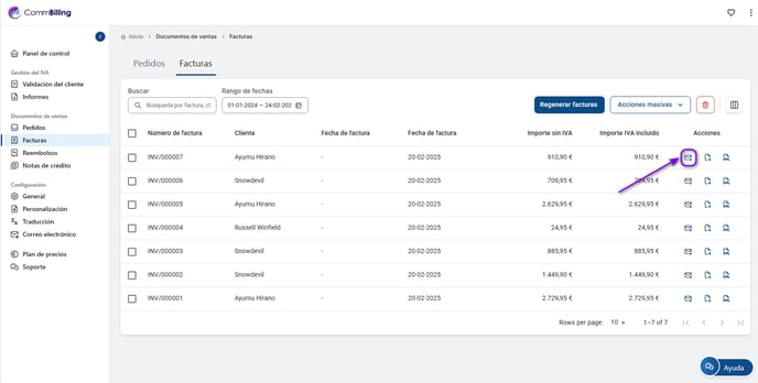 4. Haga clic en el botón Enviar correo electrónico situado junto a la factura para enviarla directamente al cliente utilizando la dirección de correo electrónico asociada a su pedido.