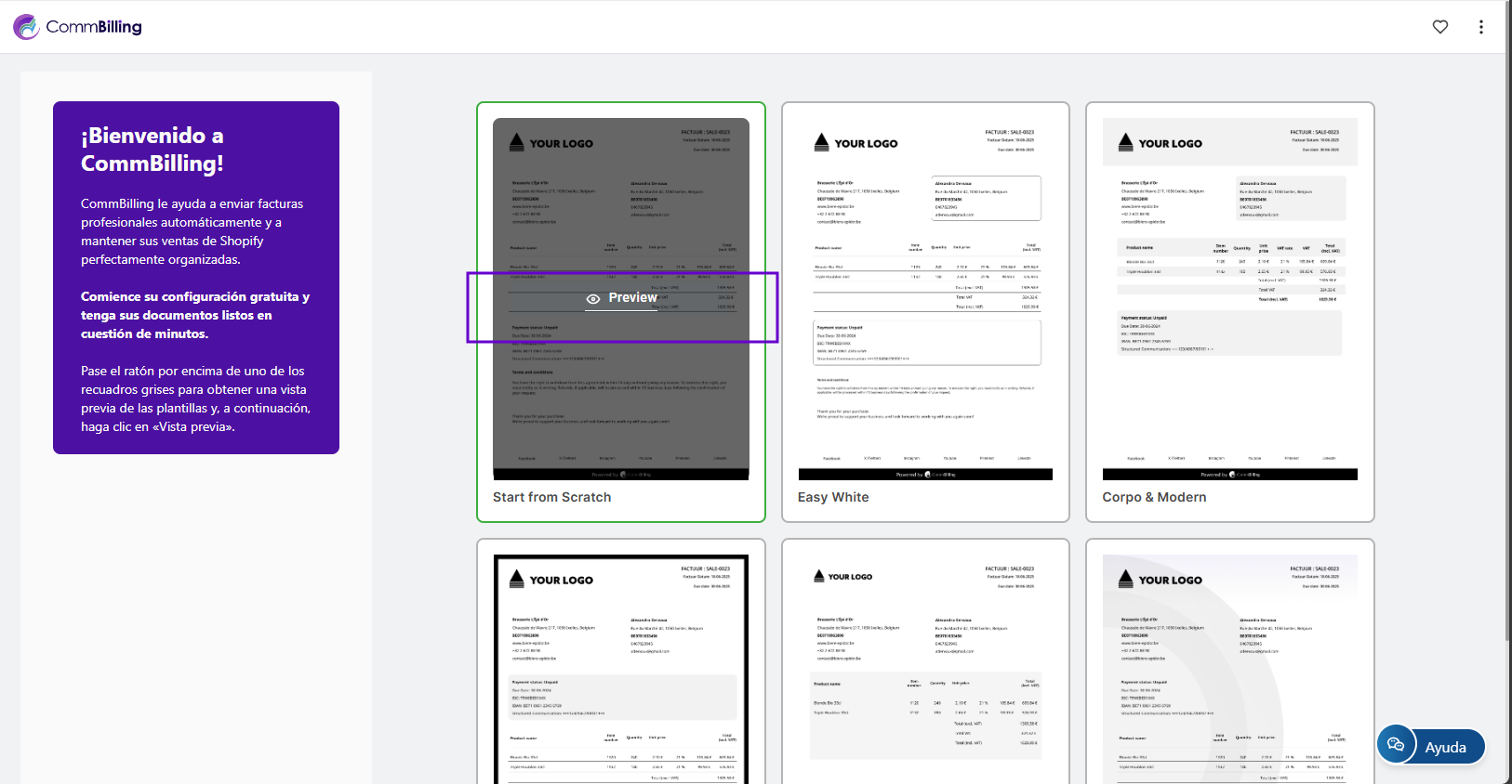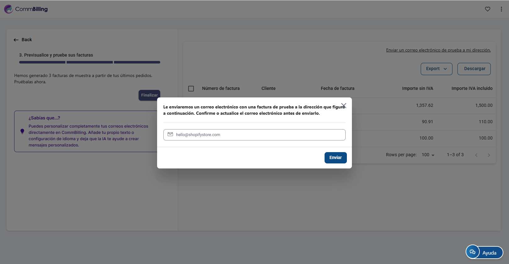 Después de instalar CommBilling desde el Shopify App Store serás guiado a través de un proceso rápido de configuración. Este onboarding te ayuda a configurar los elementos esenciales necesarios para empezar a usar la aplicación de inmediato.