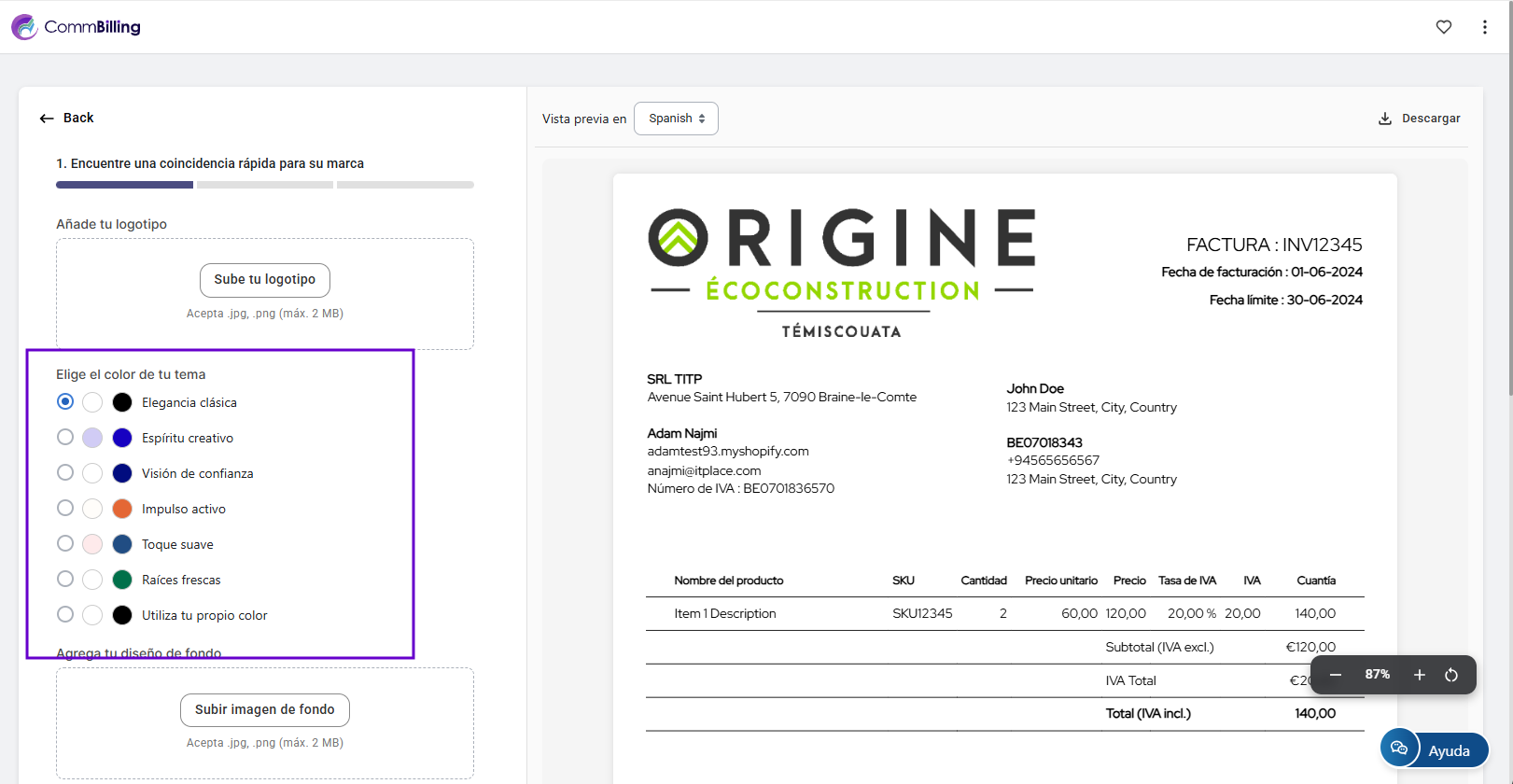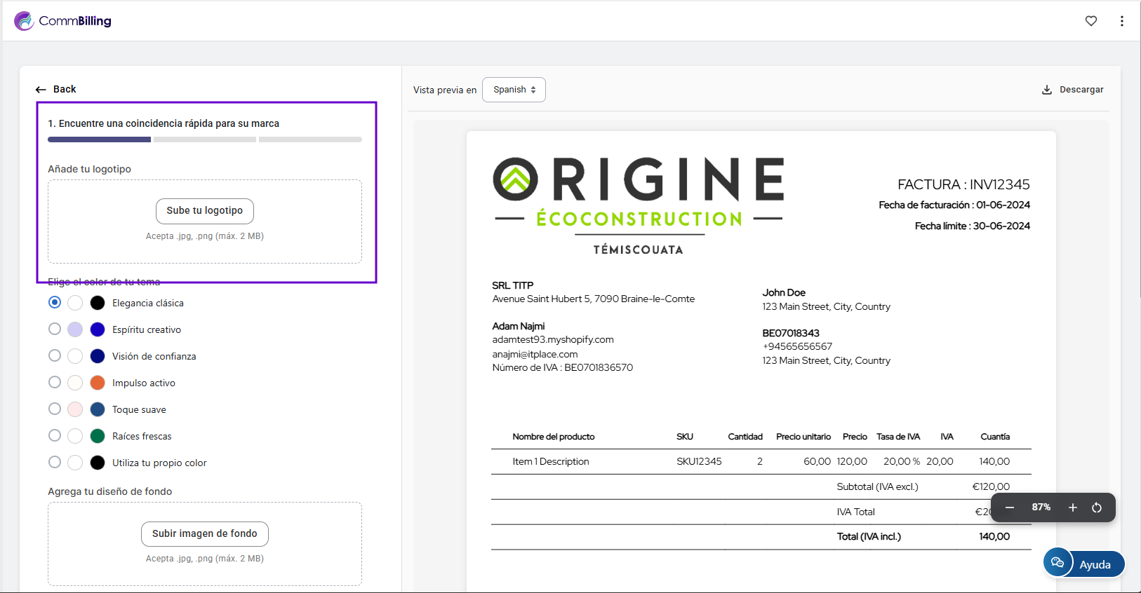 - Paso 1: Sube el logotipo de tu empresa, elige el color del tema y haz clic en Siguiente.