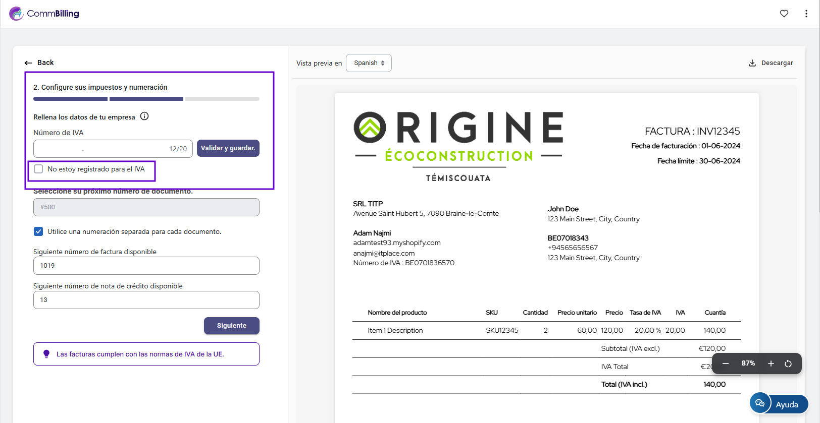 - Paso 2: Introduce tu número de IVA y haz clic en Validar y guardar o selecciona Omitir IVA por ahora si no tienes uno.