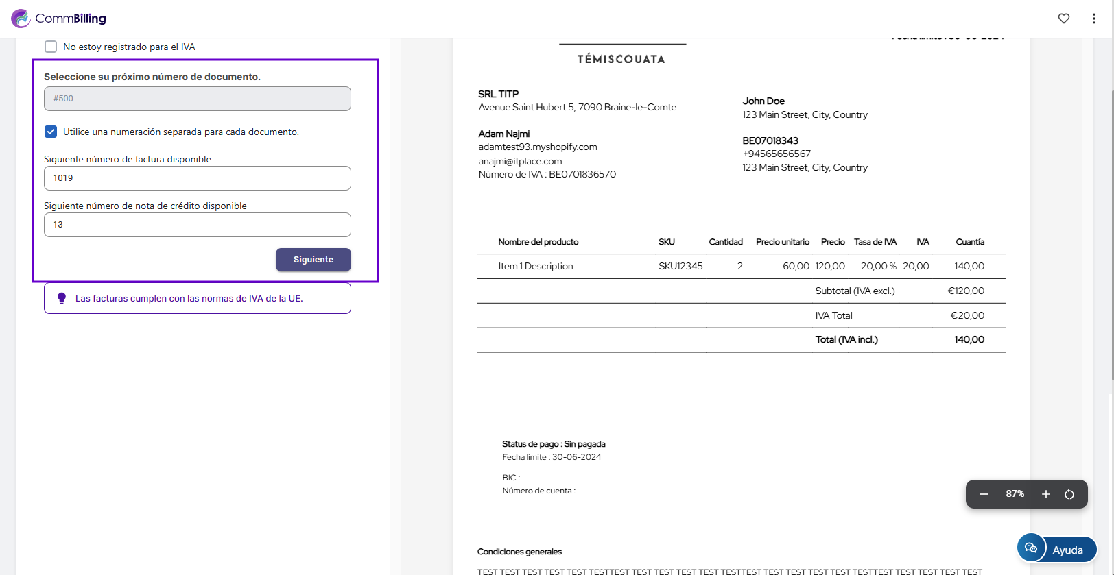 Configurar CommBilling correctamente garantiza un manejo preciso del IVA, una sincronización fluida de los pedidos, una facturación conforme a las normativas y un flujo de facturación completamente automatizado. Esta configuración inicial es esencial para garantizar que tus documentos de venta, reglas de automatización y preferencias de diseño funcionen sin problemas con tu tienda Shopify.