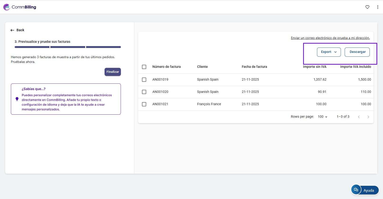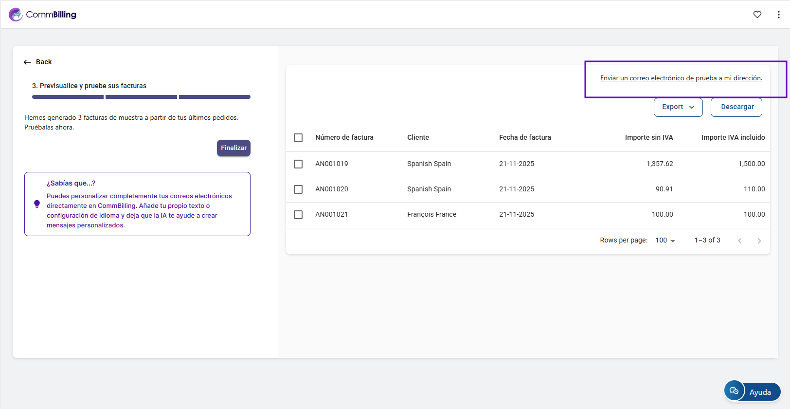 Tu configuración rápida ya está completa y tu aplicación de facturación está lista para usarse. Ahora puedes empezar a generar facturas con la ventaja adicional de que CommBilling genera automáticamente tres facturas gratuitas como parte de tu experiencia de onboarding. Otras personalizaciones pueden realizarse en cualquier momento desde la pestaña Configuración.