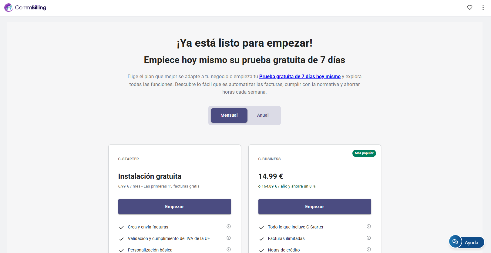 - Una vez finalizado el onboarding serás redirigido a la página de los planes de precios. La selección de un plan es obligatoria antes de poder empezar a usar CommBilling y la prueba gratuita de siete días está disponible para ambos planes.