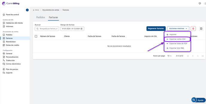 CommBilling generará y descargará automáticamente un archivo CSV con las facturas seleccionadas.