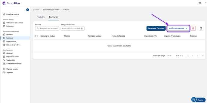 4. Una vez seleccionadas las facturas, haga clic en Acción masiva en la parte superior de la lista de facturas.