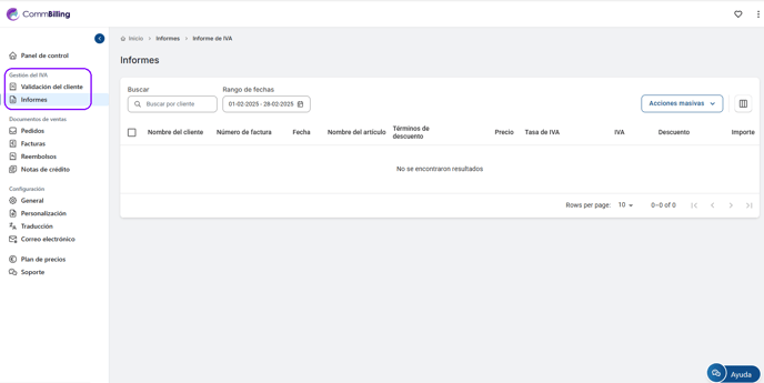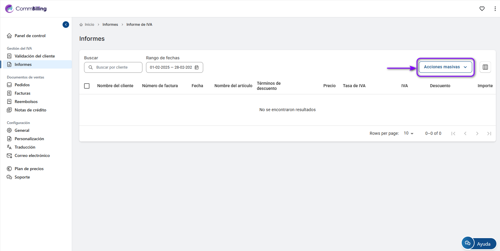 En CommBilling, los informes fiscales ofrecen una vista organizada de todos los pedidos y facturas, junto con el IVA aplicado por país. Con opciones de filtrado y acciones masivas, puede personalizar y exportar fácilmente los informes, lo que simplifica la gestión de los informes financieros y el cumplimiento de las obligaciones fiscales.