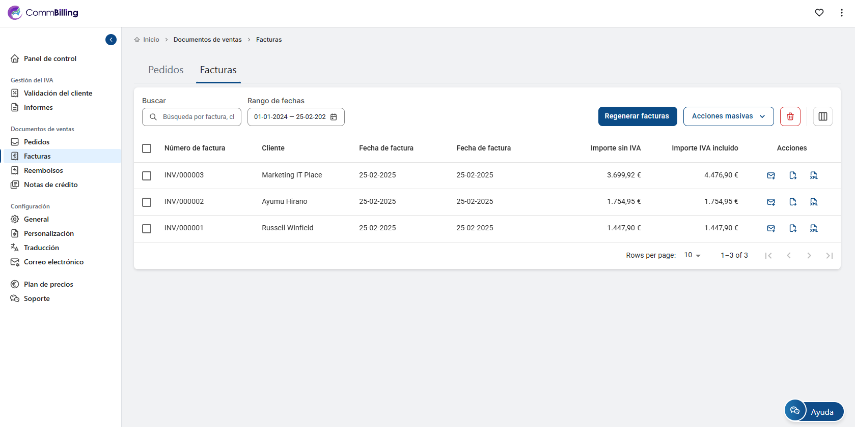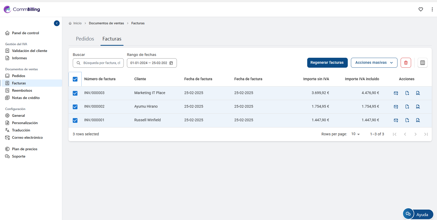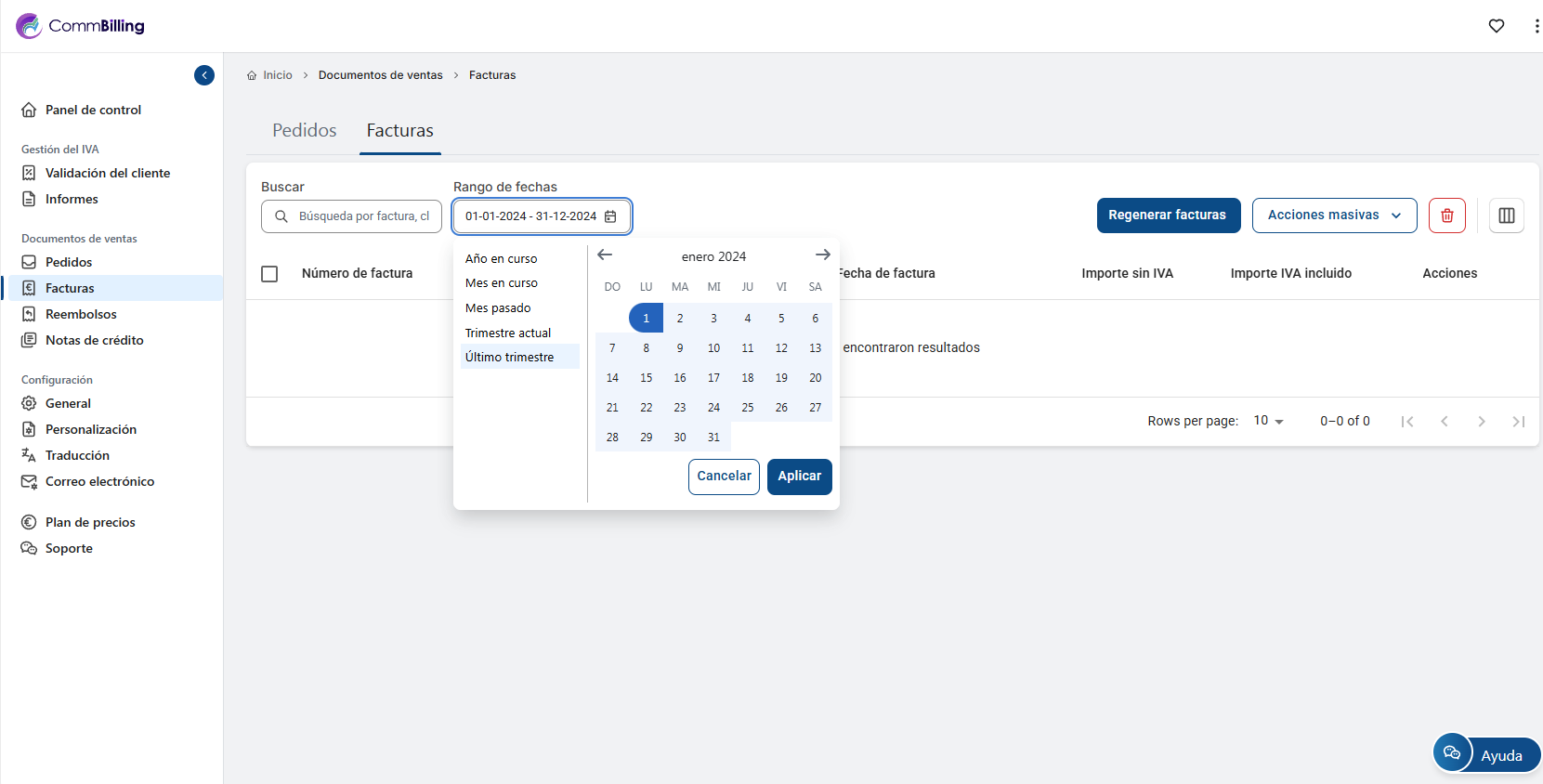 CommBilling le permite generar informes de facturas detallados filtrados por fecha, ayudándole a analizar sus ventas y a realizar un seguimiento de las facturas de periodos específicos.