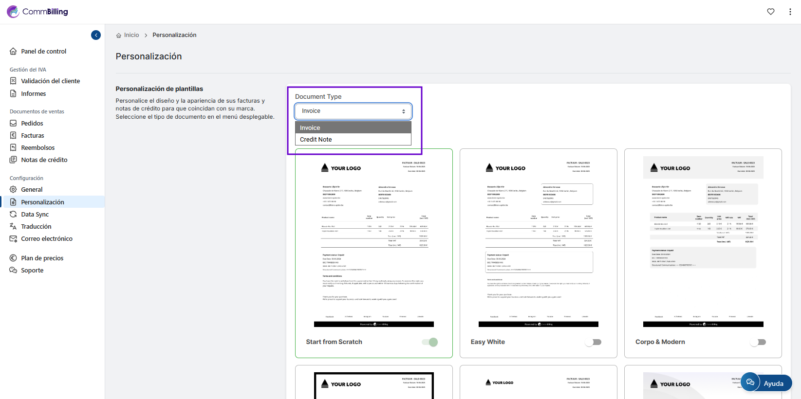 - Paso 2: En Tipo de documento, elige la plantilla de factura.