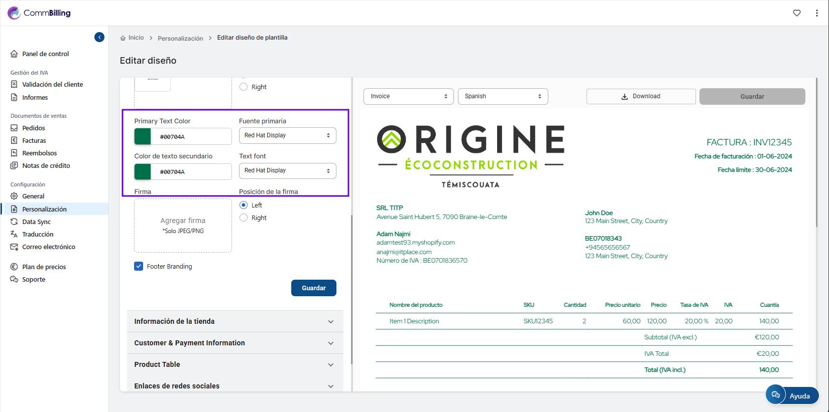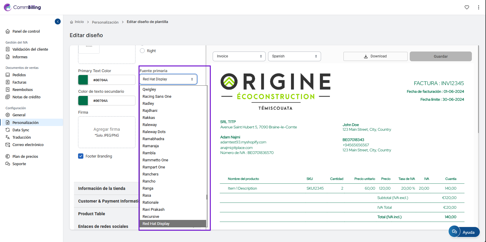 Personalizar las fuentes de tus facturas te ayuda a mantener la coherencia de tu marca y a garantizar que cada documento que envías refleje la identidad visual de tu empresa. En CommBilling puedes ajustar fácilmente el estilo de fuente utilizado en tus facturas para que coincida con el tono y las preferencias de diseño de tu negocio, creando un aspecto más profesional y personalizado.