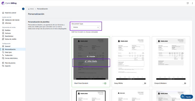 Puedes gestionar y editar el diseño de tu factura directamente desde la configuración de personalización. Sigue los pasos a continuación para ajustar el diseño de tu factura según tus preferencias.