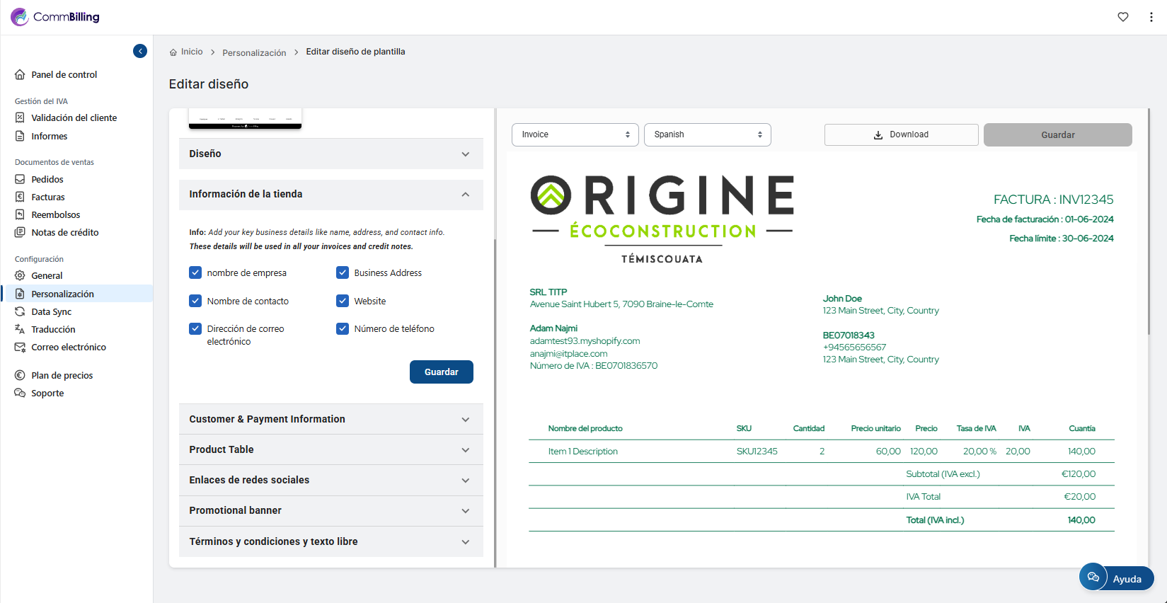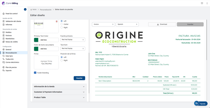 Personalizar tus facturas te permite crear documentos que reflejen plenamente la identidad y el profesionalismo de tu empresa. Con CommBilling, puedes personalizar cada aspecto visual de tus facturas, desde los colores y las fuentes hasta la colocación del logotipo y los campos mostrados, garantizando que cada documento que envíes esté alineado con tu marca y tus estándares de comunicación.