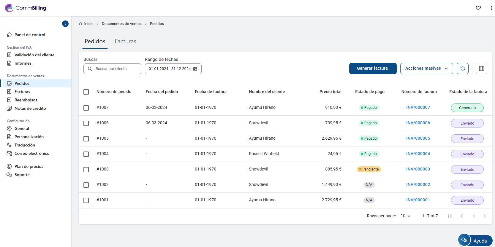 Después de hacer clic en el botón "Generar factura", el sistema procesará la solicitud. Una vez que la factura se genera con éxito, la columna de estado al lado del pedido cambiará a "Generado."