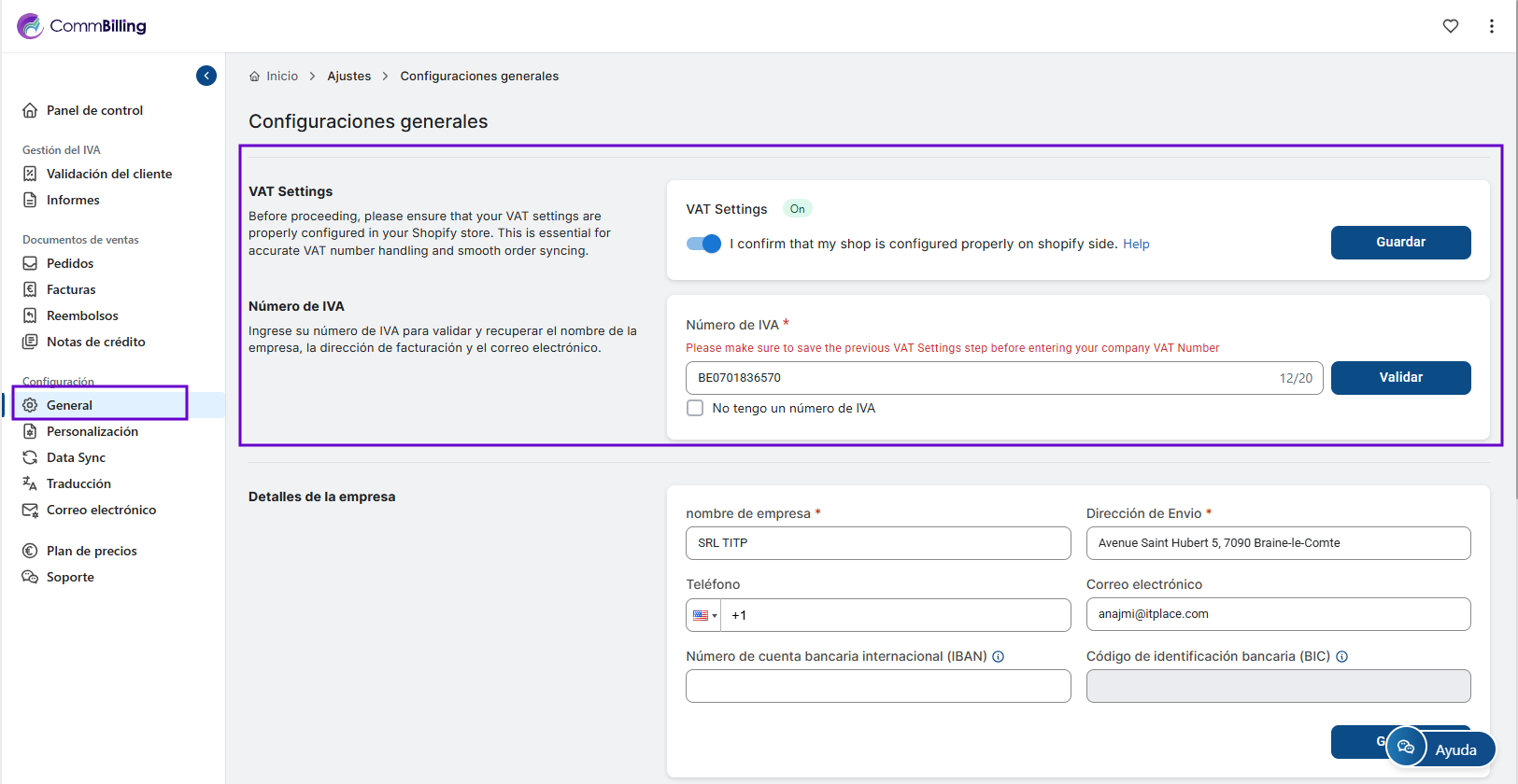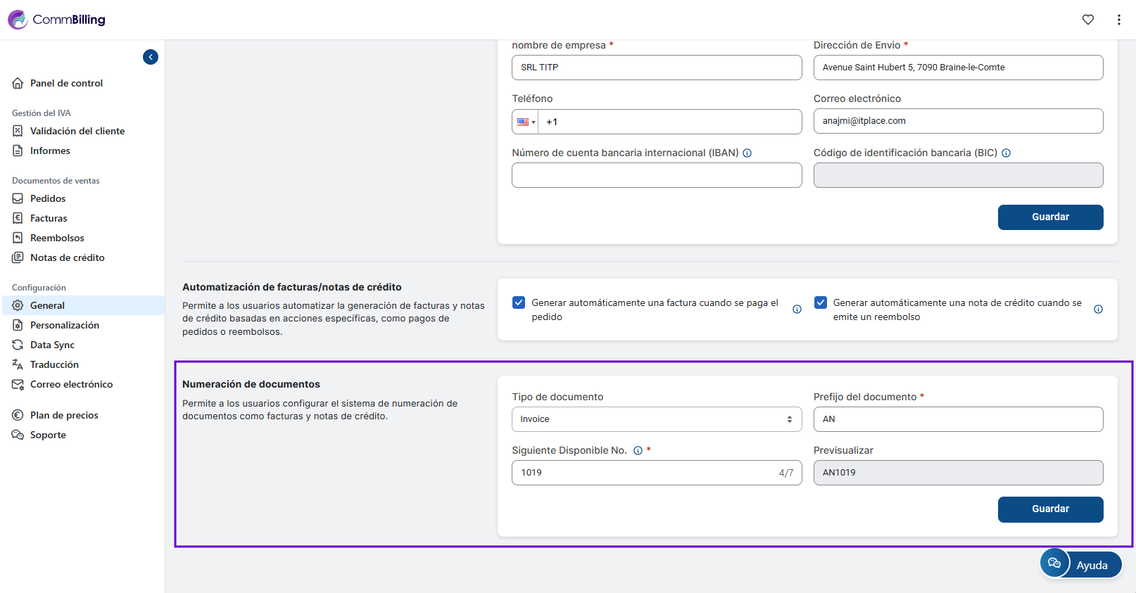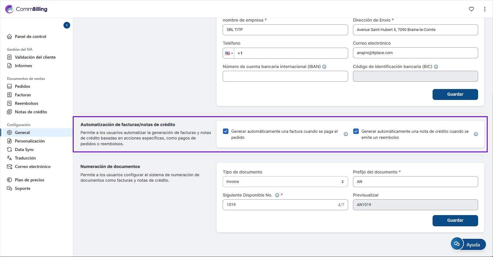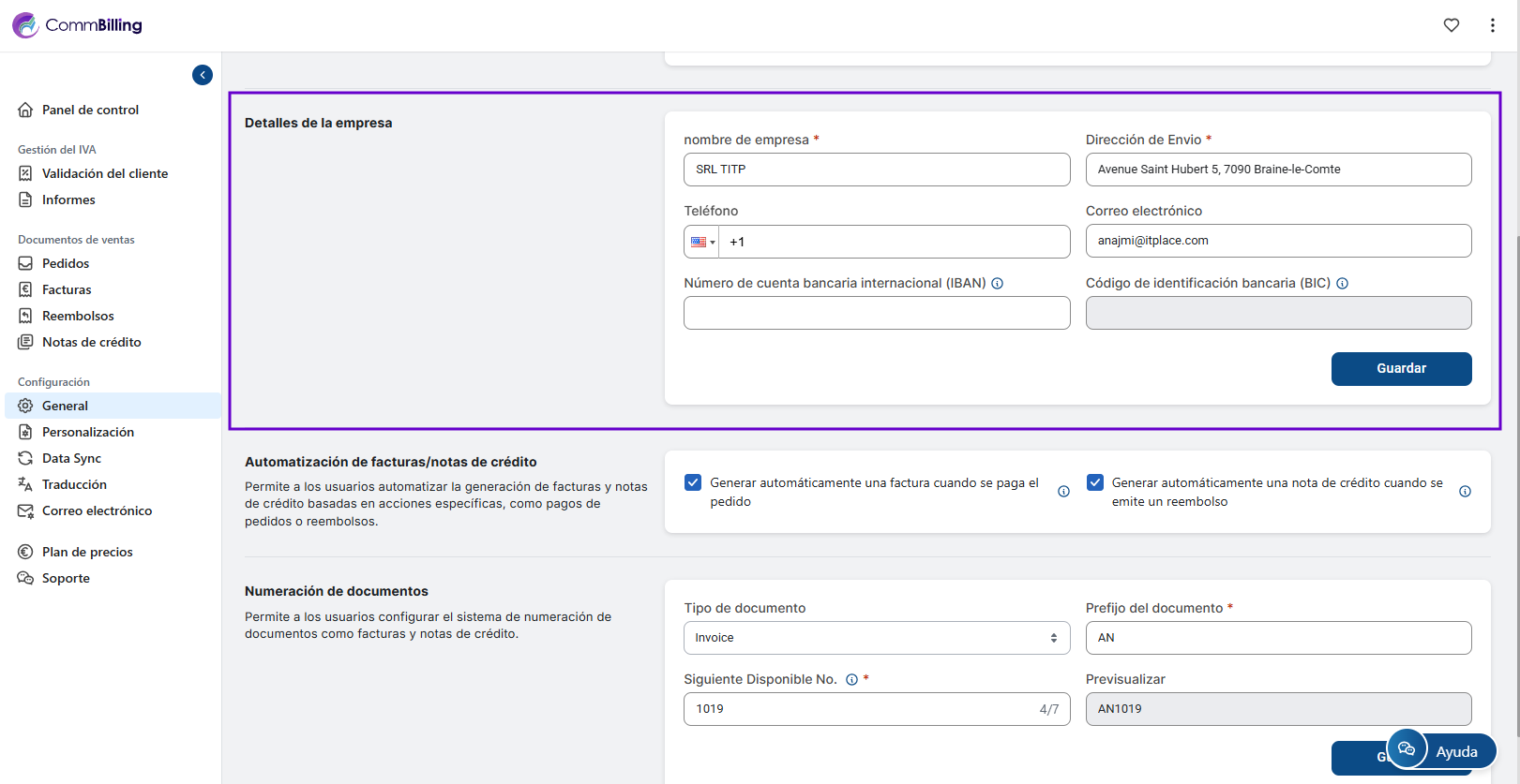 La sección Configuración general es la base de tu configuración en CommBilling. Garantiza que la información de tu empresa la validación del IVA la numeración de documentos y las reglas de automatización estén correctamente configuradas antes de comenzar a generar facturas o notas de crédito. Una configuración adecuada en esta sección garantiza precisión cumplimiento y un funcionamiento diario fluido.