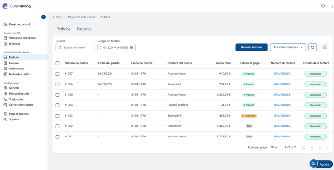 - Realice acciones en varios pedidos simultáneamente, como generar facturas o exportar datos de pedidos.
