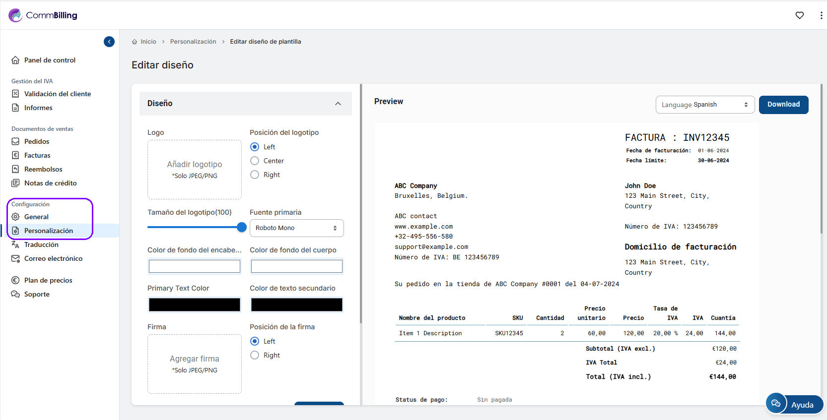 También puede personalizar sus facturas para que reflejen mejor su marca. Esto incluye añadir su logotipo, cambiar el diseño y mucho más. Para obtener instrucciones detalladas sobre cómo personalizar los documentos de ventas, consulte esta guía. La personalización de sus documentos garantiza que sus facturas coincidan con la identidad de su marca y tengan un aspecto profesional.