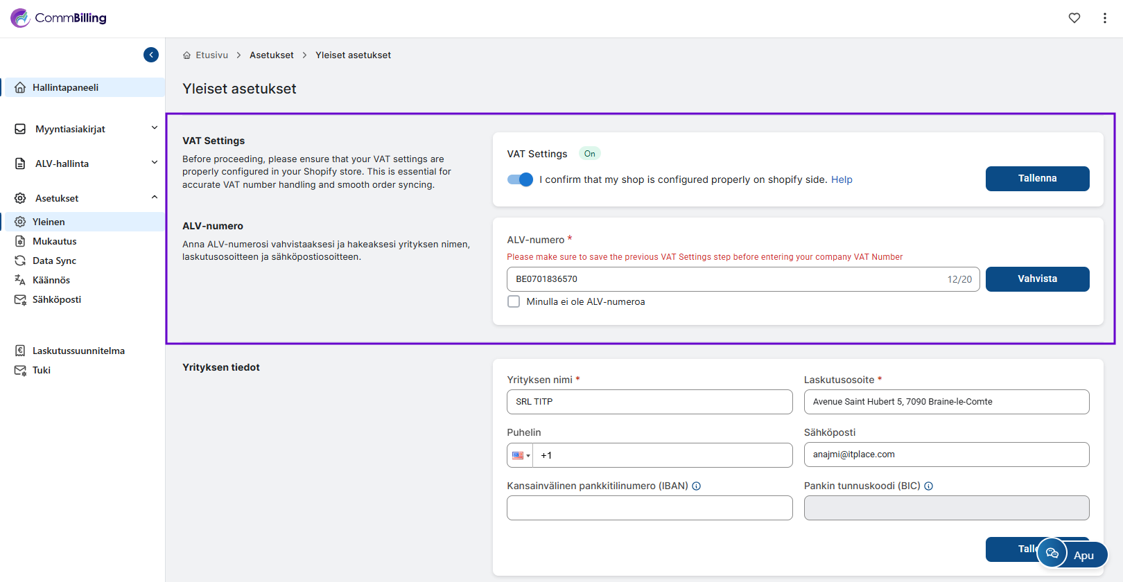 Tässä osiossa voit syöttää ja validoida kauppasi ALV-numeron. CommBilling tarkistaa automaattisesti ALV-numeron kelvollisuuden varmistaakseen, että yrityksesi pysyy EU:n ALV-säännösten mukaisena.
