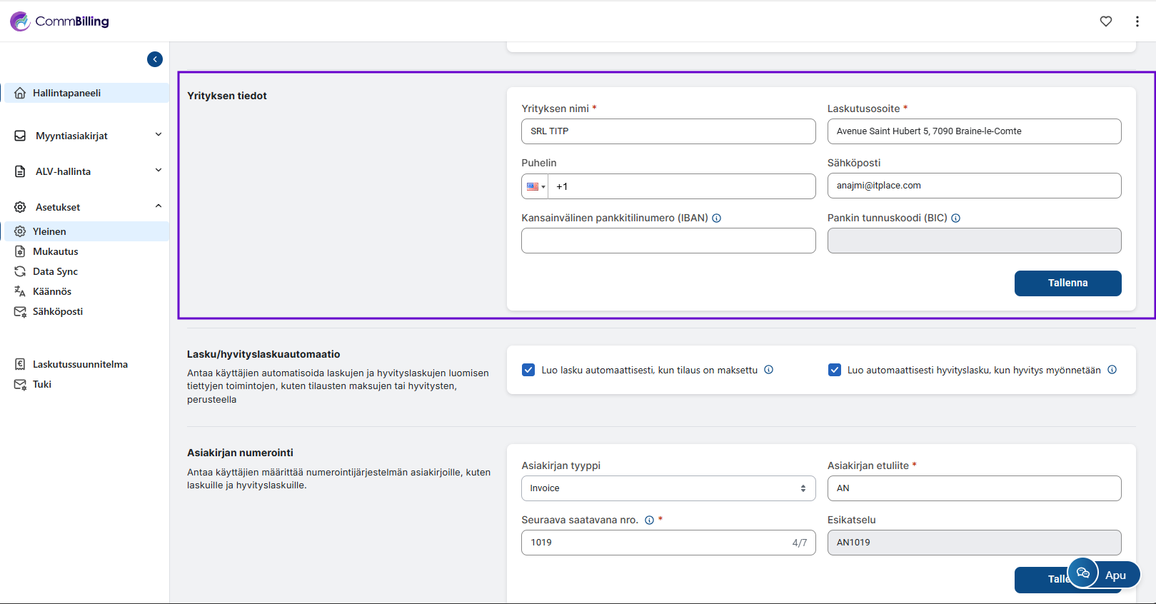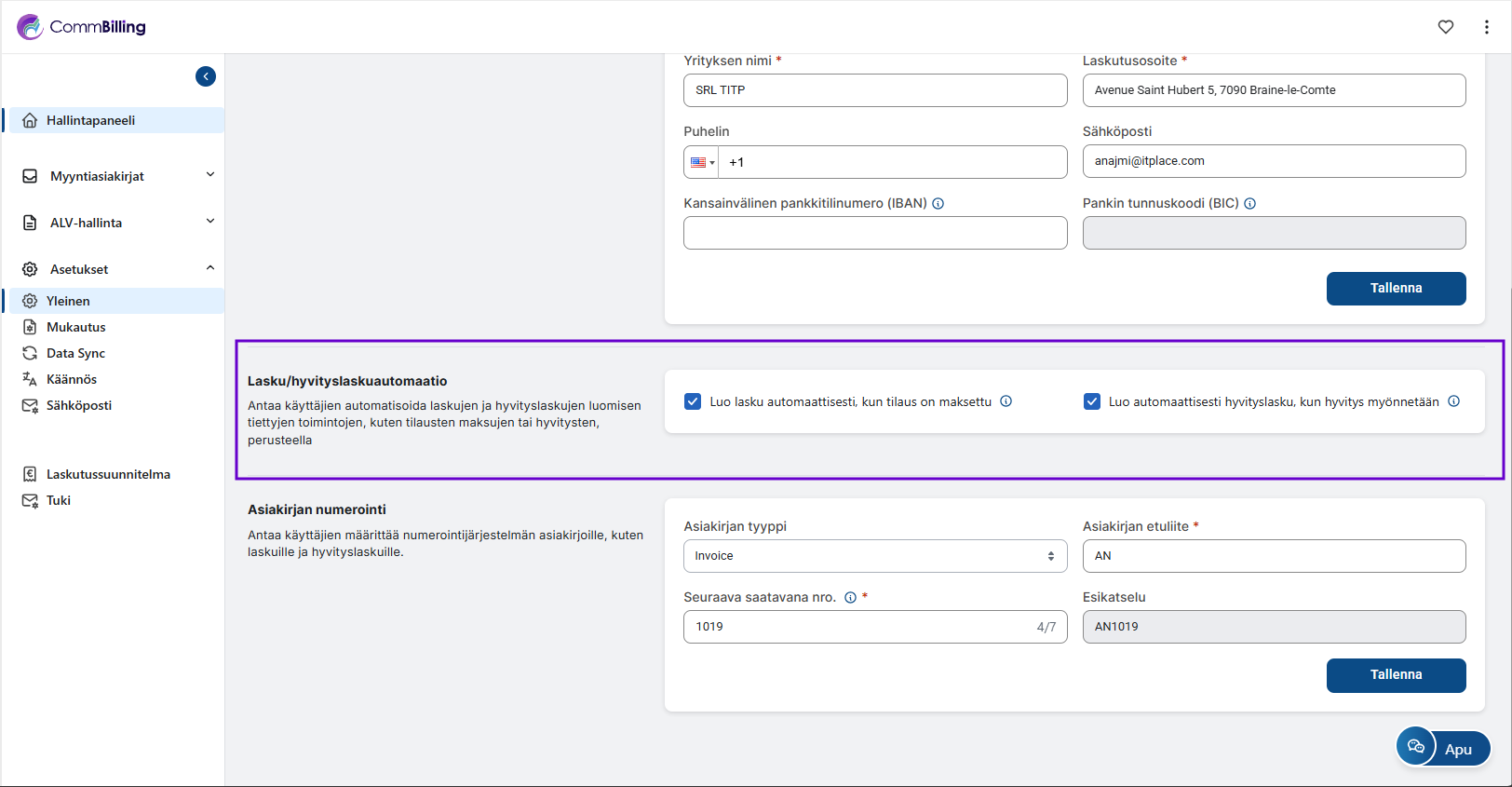 CommBillingin Asetukset välilehti kokoaa yhteen kaikki määritysasetukset jotka auttavat sinua hallitsemaan yrityksesi tietoja, automatisoimaan laskutustoimintoja ja mukauttamaan asiakirjojesi visuaalista ulkoasua.