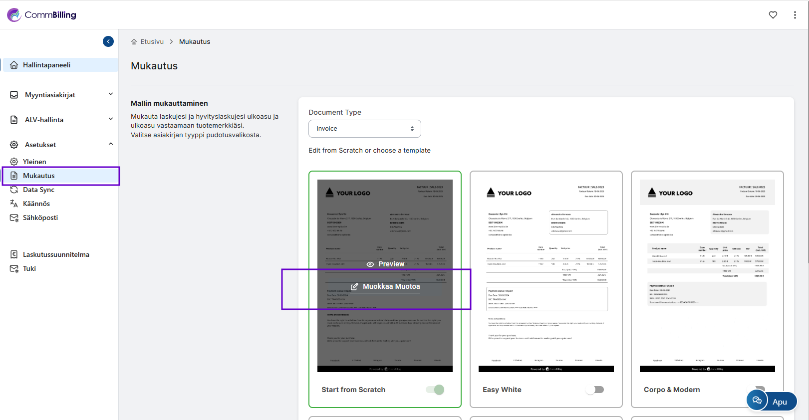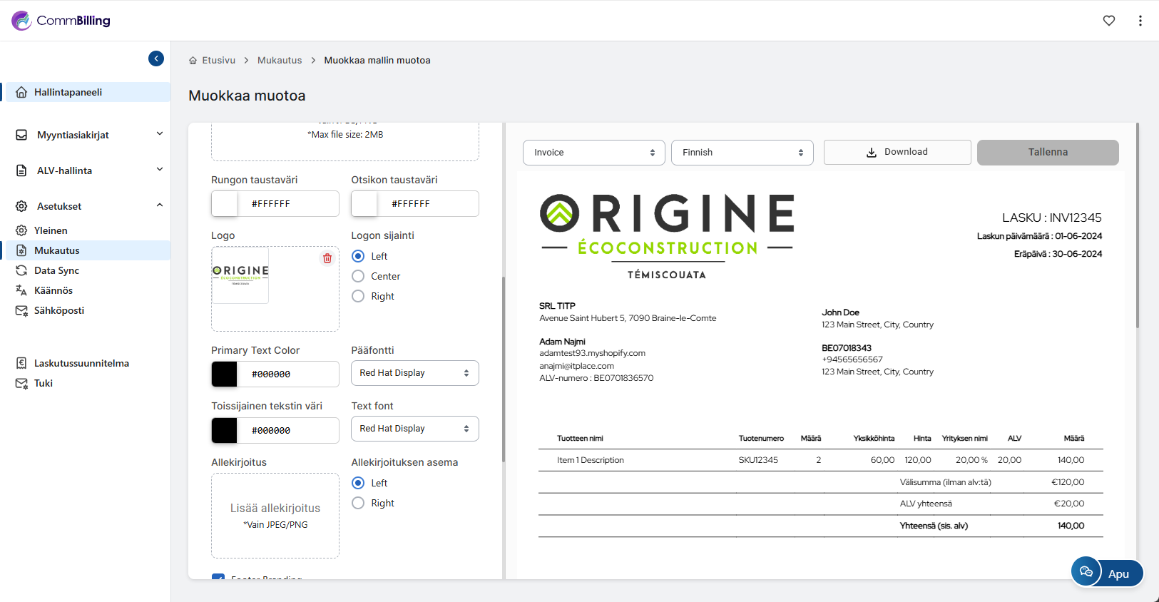 • Myyntiasiakirjan suunnittelu: Tilaussuunnitelmastasi riippuen voit täysin tai osittain mukauttaa laskujen ja hyvityslaskujen suunnittelua, mukaan lukien kauppasi logon lisäämisen, värimaailmien valinnan ja lisätietojen, kuten käyttöehtojen, lisäämisen, CommBilling-brändäyksen poistamisen jne.