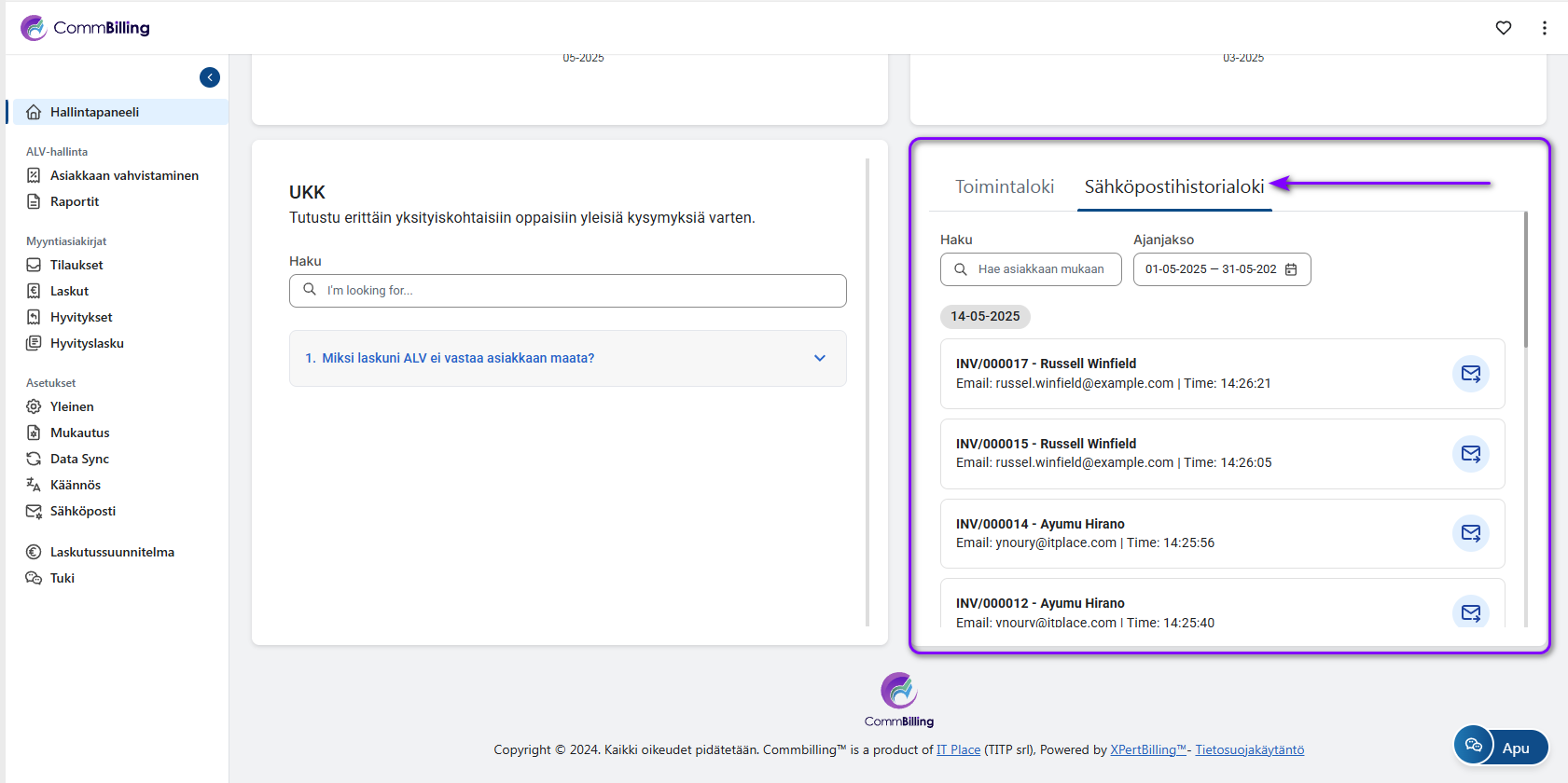 "Sähköpostihistoria" -osio seuraa kaikkia CommBillingistä lähetettyjä sähköposteja, mukaan lukien: