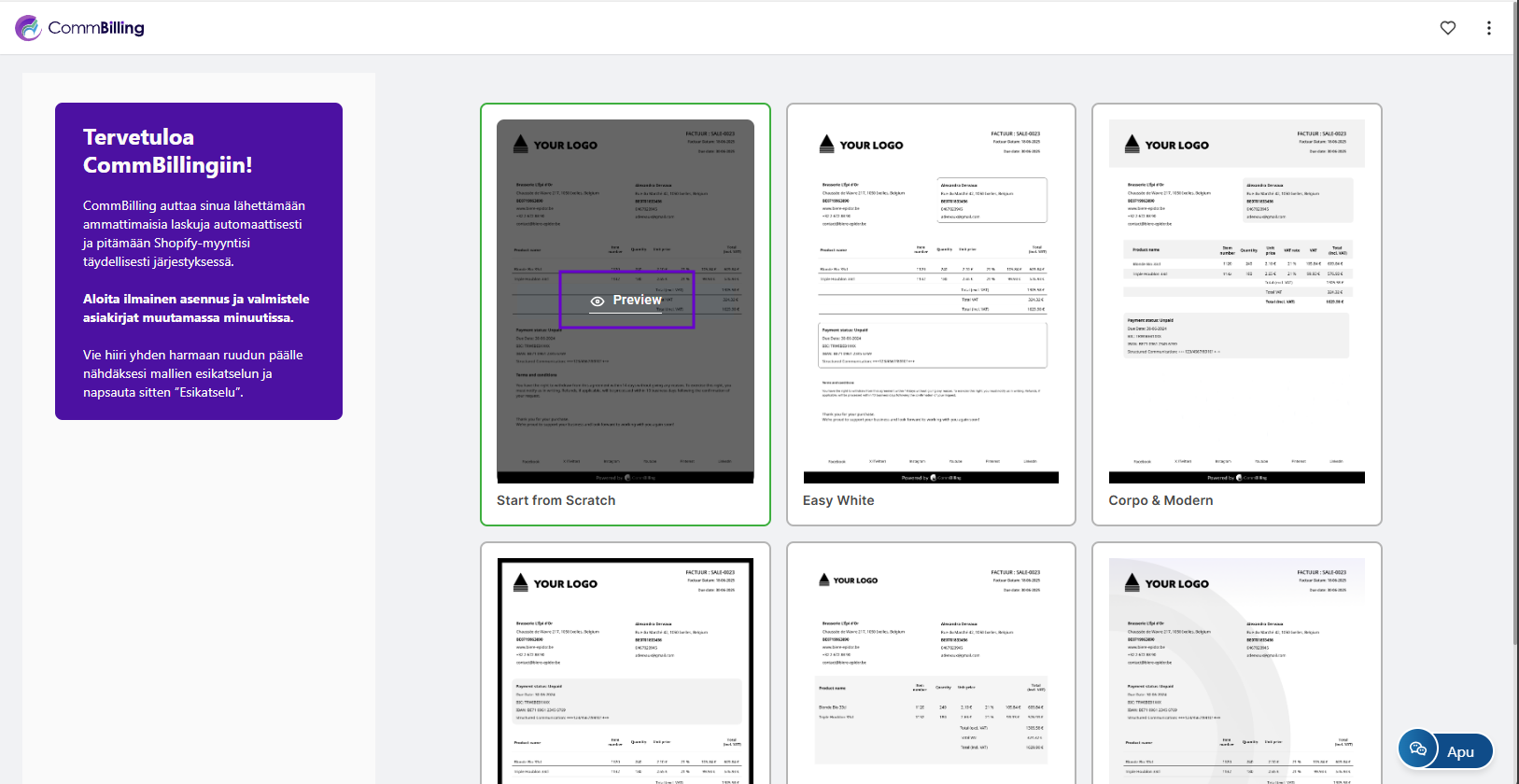 Nopea käyttöönotto on nyt valmis ja laskutussovelluksesi on käyttövalmis. Voit nyt aloittaa laskujen luomisen ja lisäksi CommBilling luo onboarding kokemuksen osana automaattisesti kolme ilmaista laskua. Lisämuokkauksia voidaan tehdä milloin tahansa Asetukset välilehdellä.