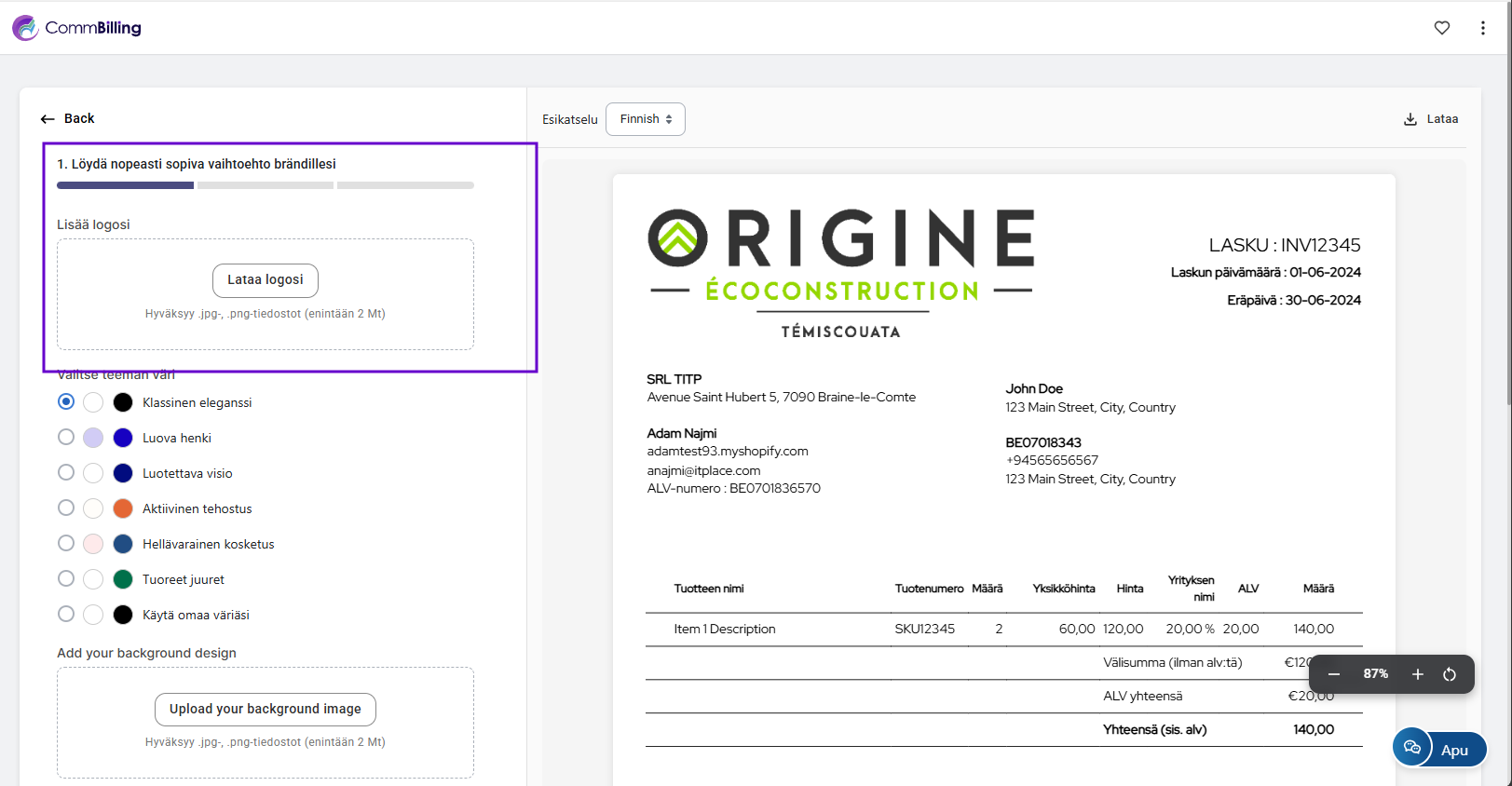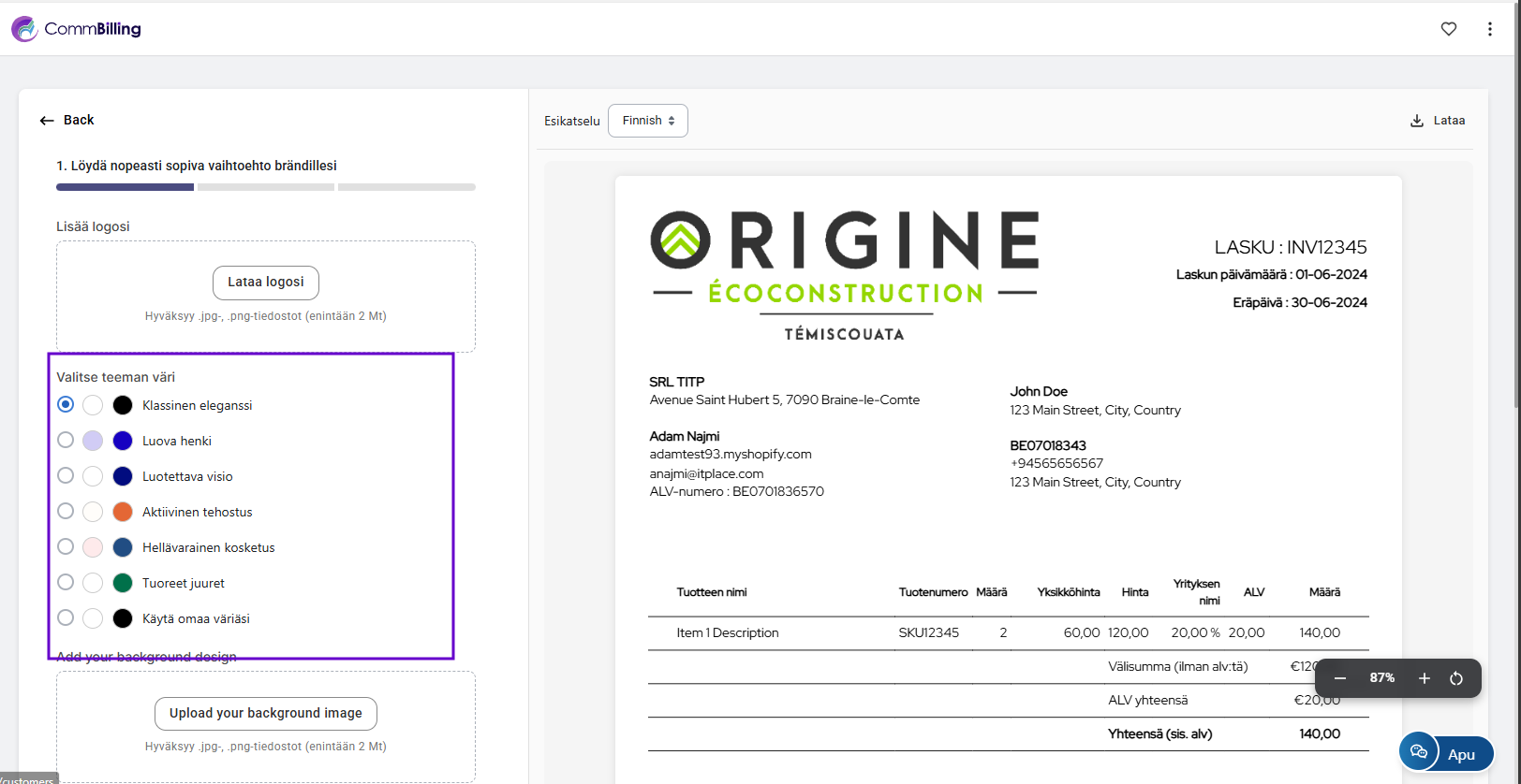 - Vaihe 1: Lataa yrityksesi logo, valitse teemaväri ja napsauta Seuraava.