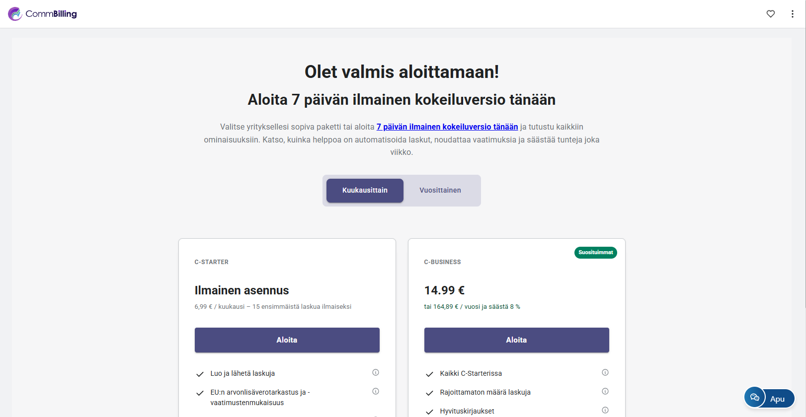- Kun onboarding on valmis, sinut ohjataan hinnoittelusuunnitelmien sivulle. Suunnitelman valitseminen vaaditaan ennen kuin voit alkaa käyttää CommBilling sovellusta ja seitsemän päivän kokeilujakso on saatavilla molemmissa suunnitelmissa.